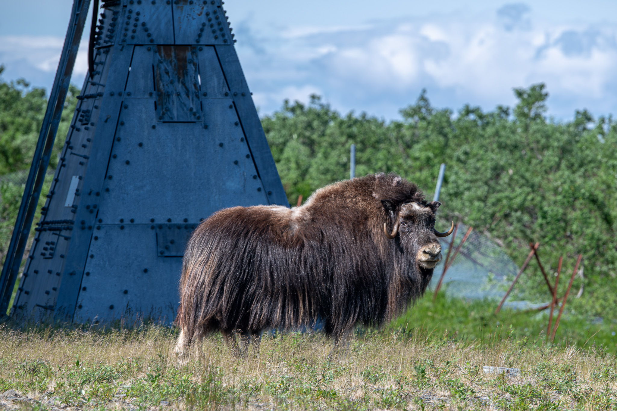 By 2016, the Anvil Mountain antennas, which have long been referred to as “Nomehenge” by locals, were the last intact remains of the White Alice system. Strange as it may sound in this epoch of satellite navigation, the White Alice site still serves as a navigational aid for mariners when low fog obscures the coastline and low-lying land near Nome. While you can see antennas from just about anywhere in Nome, you can get a closer look by heading up Anvil Mountain. That is more than a notion, however, as there are only two ways to get there: 1) an hour hike, or 2) two unprepared roads that require a high-clearance vehicle. If you are hearty enough, though, and have the time to make the trip, you will be rewarded with sweeping views of Nome, the Bering Sea, and the surrounding tundra. At the top, you’ll see various alpine flowers, and wildlife including American golden plovers and muskox The author and his wife were set to embark on the HX Expeditions cruise ship SS Roald Amundsen, on July 8, 2025, so we flew into Nome the day before with a bold road trip plan, 1) Make the 142-mile round trip to Teller, 2) drive to the top of Anvil Mountain, and 3) take the Nome-Council Highway to the Train to Nowhere, a 64-mile round trip. By the end of the day, we’d driven over 200 miles on the gravel “highways” of the Seward Peninsula. Our philosophy is that we might not ever come back, so do as much as possible.