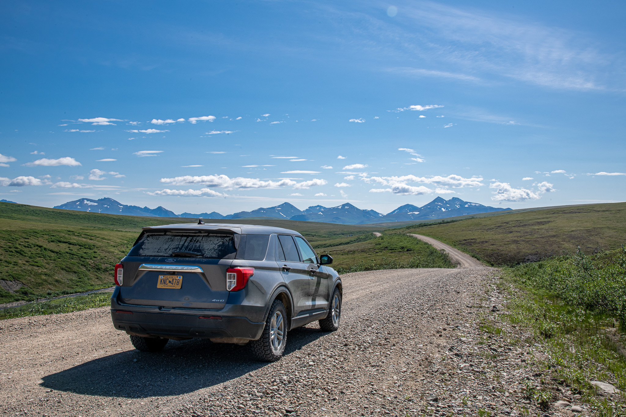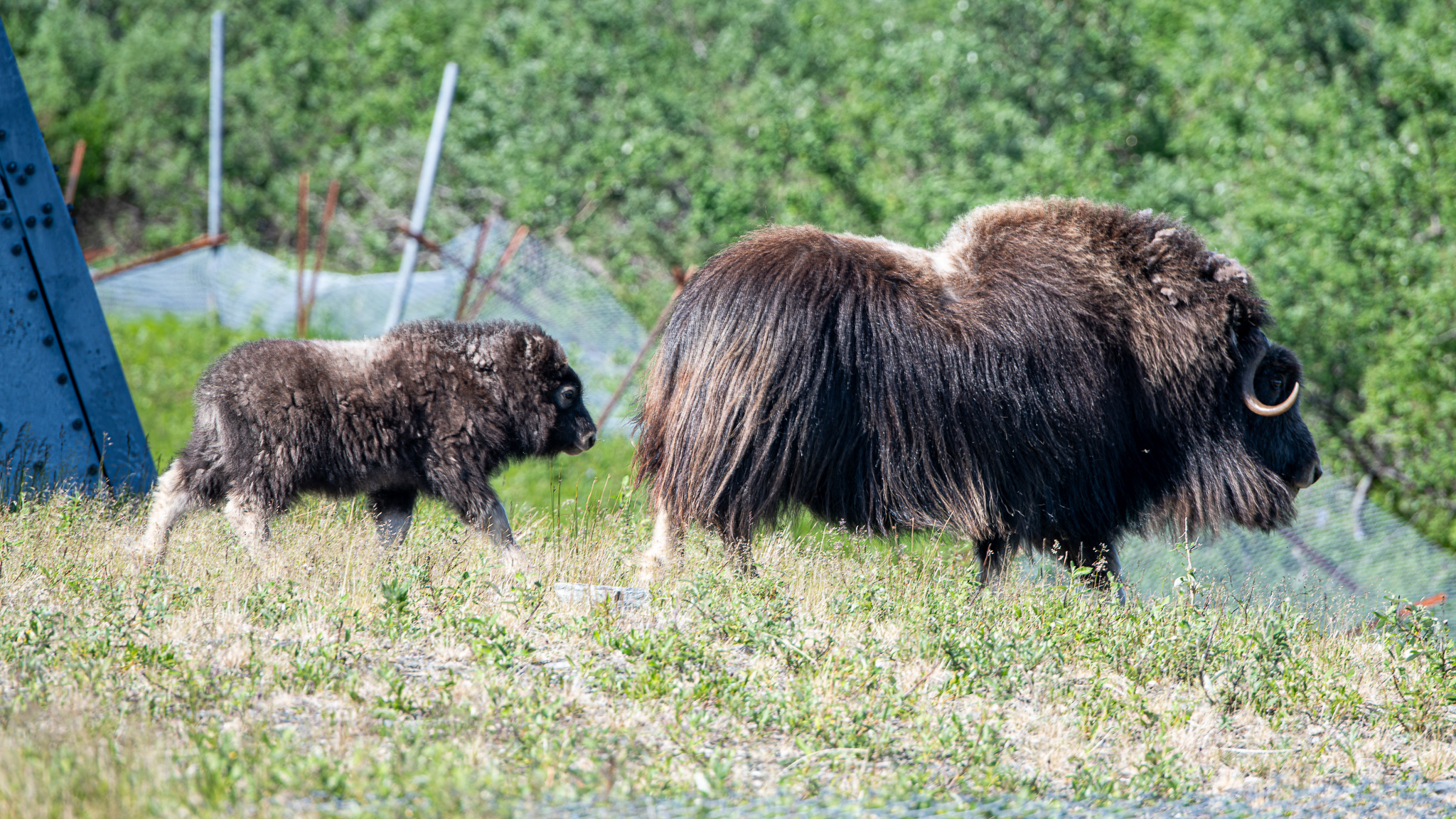 Our rental was an AWD Ford Explorer that was equipped with a hefty set of BFGoodrich Baja Champion All-Terrain tires, which was more than we needed for the drives to Teller and halfway to Council, but it was barely enough vehicle for the climb up Anvil Mountain. The 1.7-mile Anvil Mountain Tower Road that leads to the site is not well-maintained, heavily rutted, and topped with loose gravel and small rocks with larger rocks hidden underneath that could be fatal to an oil pan if not negotiated carefully. As such, our maximum speed on the road was three mph. For a majority of the climb, the towers are not visible and don’t fully reveal themselves until you round the last bend at the top. On this day, we were startled to see a female muskox and her calf just a few feet away. I took a few photos from the safety of the car as they made their way into the brush.