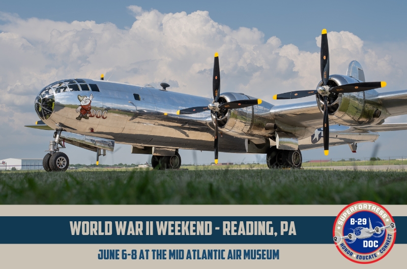 The iconic B-29 Superfortress known as “DOC” will be featured at the 2025 World War II Weekend in Reading, Pennsylvania, set for June 6-8. Hosted by the Mid-Atlantic Air Museum, the event will showcase one of only two airworthy B-29s in the world.