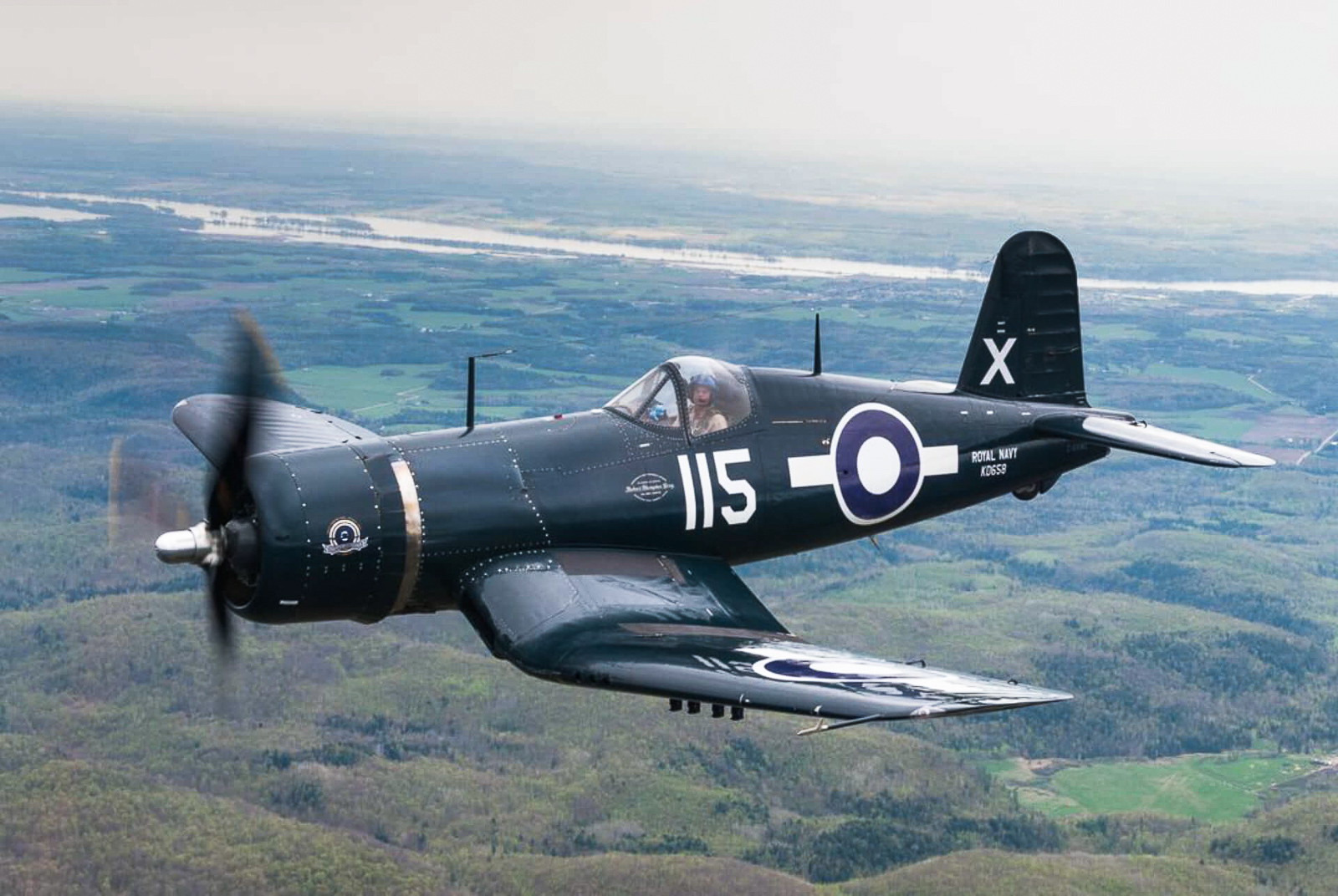 Goodyear Aircraft completed BuNo.92106 at their factory in Akron, Ohio during the Spring of 1945, with the U.S. Navy formally accepting her on May 17th. According to her movement card, the aircraft did make it out to the Pacific Theatre before the end of WWII, but did not see combat, returning Stateside in early 1946. After coming home, the Corsair joined the pool at NAS Norfolk in Virginia, and then at NAS Jacksonville in Florida before flying with Naval Reserve units in New Orleans, Seattle, Grosse Ile, Dallas, and Spokane. The Navy struck her at NAS Spokane in Washington State on September 9th, 1954 after a 1,437 hour military flying career. Len Berryman acquired the aircraft as surplus in May 1958, and moved it by road to his place in Bridgeport, Washington, putting the old fighter on display at the eponymous Berryman Park (which still features several military aircraft and relics in its war memorial area). Here the Corsair sat until the early 1970s when the legendary David Tallichet worked out a deal for its acquisition. 92106 had not flown in nearly two decades by this point, but the Corsair was cajoled into a flyable condition for the journey down to Tallichet’s base in Chino, California. Given that the ferry pilot didn’t trust the hydraulics, he chose to make the flight to Chino with the Corsair’s landing gear locked down (and tail hook removed)… it must have been quite a daunting journey for him! Once at Chino, Tallichet had the aircraft more formally refurbished, registering it as N6897 with the FAA. By the mid-seventies, 92106 was performing in the role for which she is now famous for, acting the part of a VMF-214 Corsair in the TV show Baa Baa Blacksheep, which depicted the largely fictionalized accounts of Gregory ‘Pappy’ Boyington and his ‘Blacksheep’ as they ‘duked it out’ with the Imperial Japanese Navy in the South Pacific during WWII. 92106 had a starring role in this theatre, flying alongside several other Corsairs and vintage warbirds. After her TV antics, 92106 went through a long period in dormancy, gathering dust at the back of Tallichet’s hangar in Chino, California. Gary Kohs purchased the aircraft from Tallichet in 1989. Well known for his extraordinary company Fine Art Models, which produces exacting miniature replicas of celebrated mechanical objects (including two spectacular 1:15 scale Corsair variants), Gary Kohs commissioned John Lane to restore his FG-1D to factory-fresh condition at Lane’s workshop, Airpower Unlimited, in Jerome, Idaho. Lane worked his magic on the Corsair, which looked magnificent following his team’s efforts, indeed so magnificent that the aircraft won the Experimental Aircraft Association’s prestigious “Grand Champion: World War II” award at Oshkosh in August, 2003. Soon after this, Mike Potter acquired the Corsair for Vintage Wings of Canada, based in Gatineau, Quebec. The aircraft soon became a crowd favorite, now dressed as a Royal Navy Corsair Mk.IV (KD658) which a Canadian, Lt. Robert Hampton Grey, flew with 1841 Squadron aboard HMS Formidable during the closing months of WWII. As most will know, Hampton earned a posthumous Victoria Cross in KD658, sinking the Imperial Japanese Navy destroyer Amakusa off the Japanese coast in Onagawa Bay on August 9th, 1945.