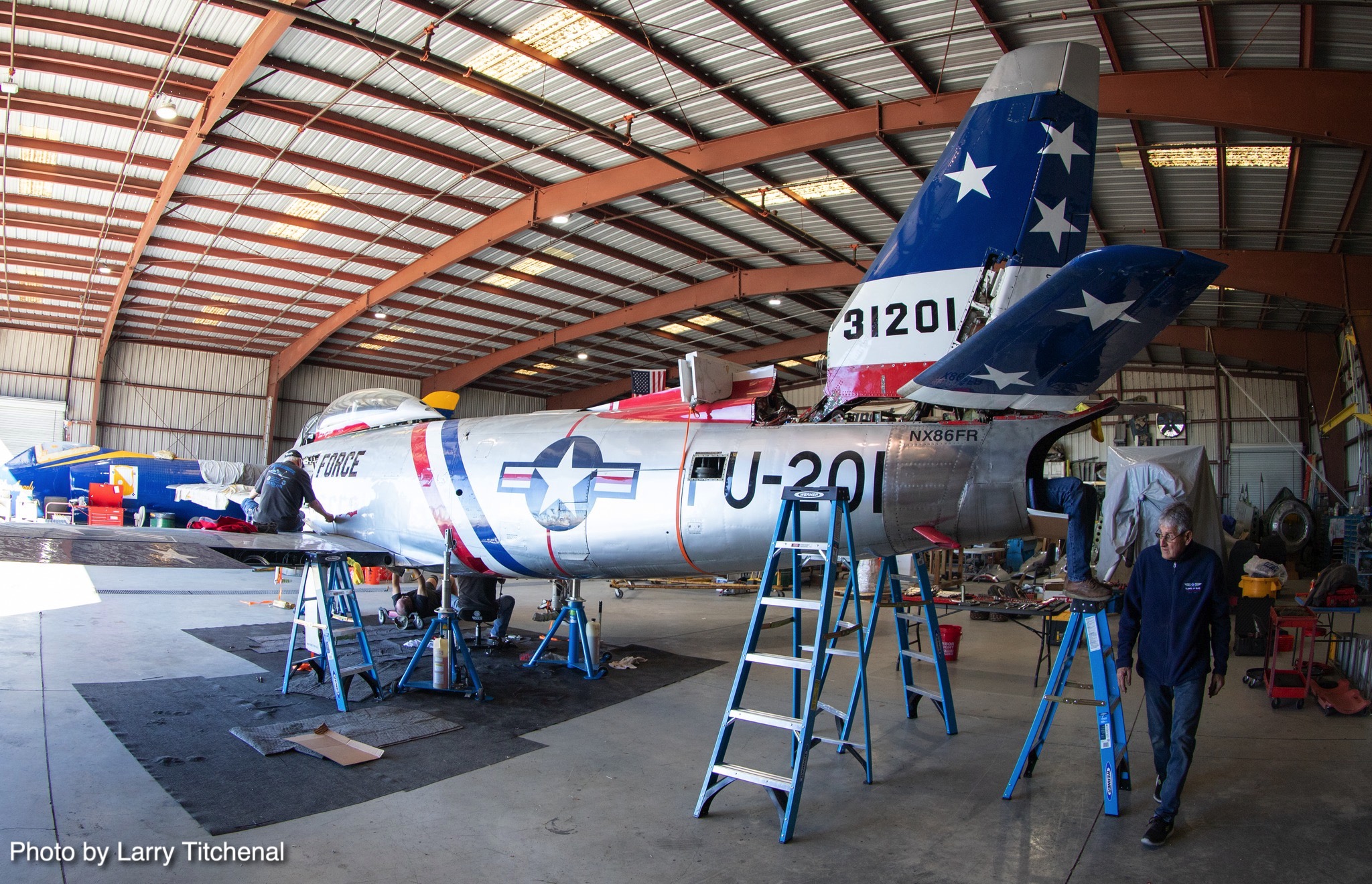 Steve Hinton’s Fighter Rebuilders aircraft restoration workshop is set to restore North American F-86F Sabre 52-4959. This Sabre has dazzled air show crowds for many years adorned in the iconic livery of the Skyblazers aerial demonstration team, forerunner of the present-day USAF Thunderbirds. A new owner based on the west coast acquired the jet about six month’s ago and chose Hinton’s shop to refurbish the airframe. We received a few images of the aircraft undergoing disassembly from Larry Titchenal, who volunteers with the Valiant Air Command Warbird Museum at Space Coast Regional Airport in Titusville, Florida. Steve Hinton and his son, Steve Hinton jr carried out the work with other team members. The vintage fighter will make the journey to Chino, California by road in a few days.