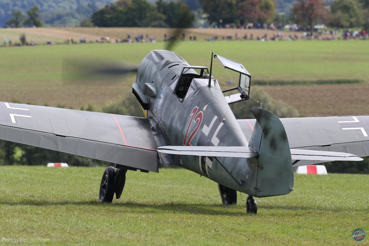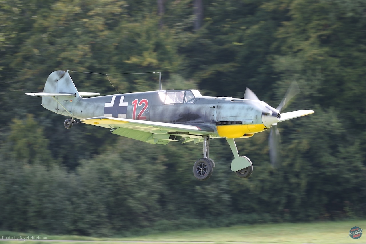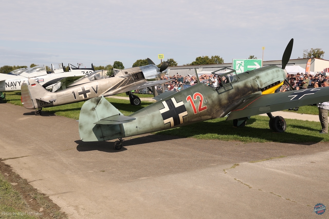 While it is predominantly a vintage aircraft fly-in/airshow, there have been more and more warbirds participating over the years, some just flying in and their crews watching the show, others taking part in the flying display. Thursday and Friday are arrival days, with a few practice displays, and Saturday and Sunday are the organised display days. Things start early with the the runway filled with vintage gliders which are then all towed up at 0915 to open the event, once they are down the field is open for more arrivals until 1100 and then its time for displays, around every 20 minutes, so no rushing and time to look around too, this goes on until the finale, Michael Carlson flying his Bleriot XI at sunset around 1900, followed by the Red Bull Blanik glider duo with their pyrotechnics, landing in the last light. But it doesn’t end there, now lights illuminate some of the aircraft on the flightline, and everyone heads for the food and beer vendors for the rest of the evening, a great time to meet friends and have some good German food. Many people are there until late in the night at the hangar party. Unfortunately, this year the weather on the Sunday wasn’t good, with frequent showers passing through, so the formal display program was cancelled,d and aircraft were permitted to leave when they could to be able to get back to their bases. It was still a great sight watching all the departures, and there were several displays that happened anyway. Monday was the official departure day, particularly for the non-display aircraft, but there were only 60 or 70 left, which slowly departed as weather allowed. This year, the warbird highlight was the Messerschmitt Bf 109E D-FEML flown in by Charlie Brown from its base at Bonn Hangelar.