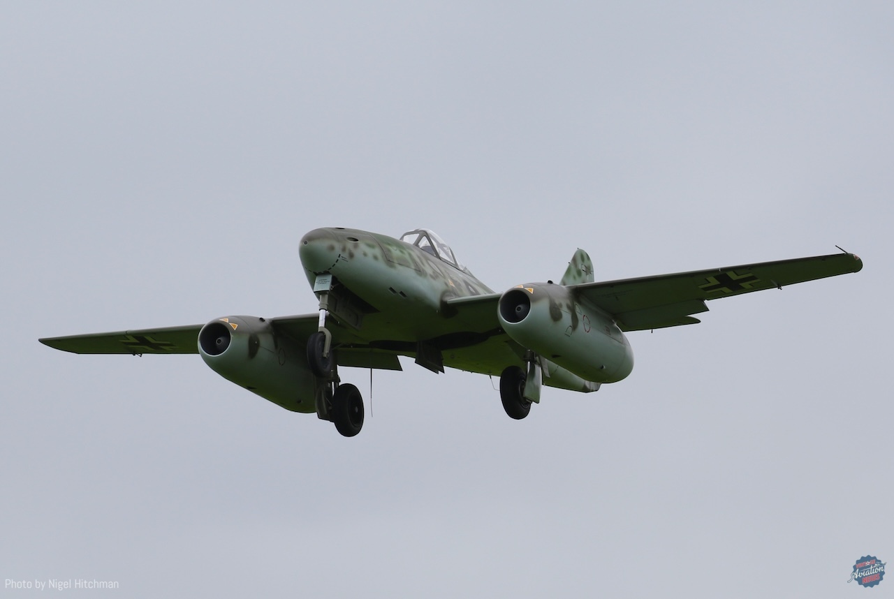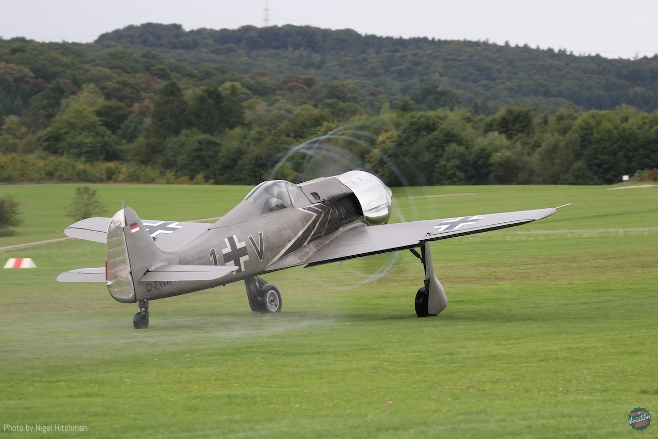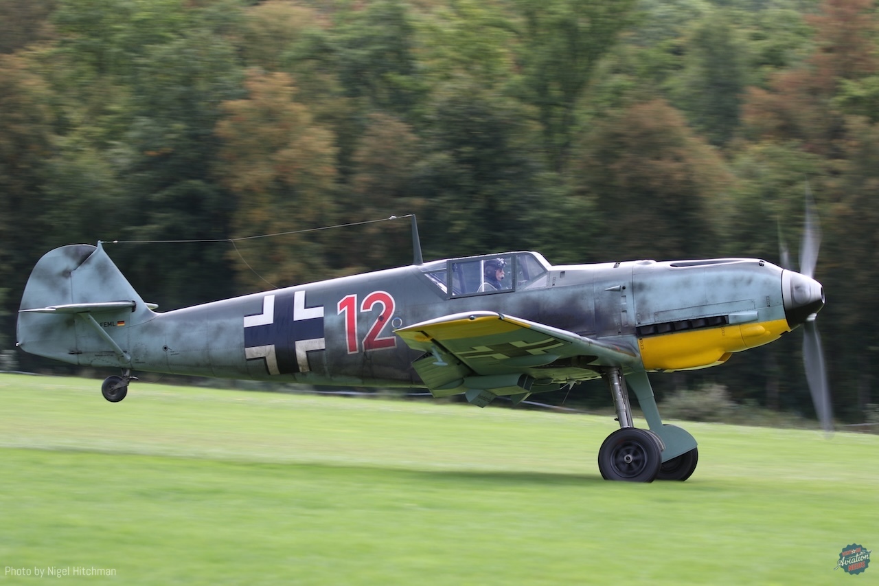 While it is predominantly a vintage aircraft fly-in/airshow, there have been more and more warbirds participating over the years, some just flying in and their crews watching the show, others taking part in the flying display. Thursday and Friday are arrival days, with a few practice displays, and Saturday and Sunday are the organised display days. Things start early with the the runway filled with vintage gliders which are then all towed up at 0915 to open the event, once they are down the field is open for more arrivals until 1100 and then its time for displays, around every 20 minutes, so no rushing and time to look around too, this goes on until the finale, Michael Carlson flying his Bleriot XI at sunset around 1900, followed by the Red Bull Blanik glider duo with their pyrotechnics, landing in the last light. But it doesn’t end there, now lights illuminate some of the aircraft on the flightline, and everyone heads for the food and beer vendors for the rest of the evening, a great time to meet friends and have some good German food. Many people are there until late in the night at the hangar party. Unfortunately, this year the weather on the Sunday wasn’t good, with frequent showers passing through, so the formal display program was cancelled,d and aircraft were permitted to leave when they could to be able to get back to their bases. It was still a great sight watching all the departures, and there were several displays that happened anyway. Monday was the official departure day, particularly for the non-display aircraft, but there were only 60 or 70 left, which slowly departed as weather allowed. This year, the warbird highlight was the Messerschmitt Bf 109E D-FEML flown in by Charlie Brown from its base at Bonn Hangelar.