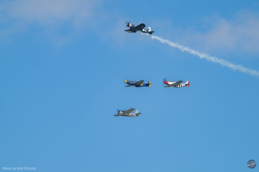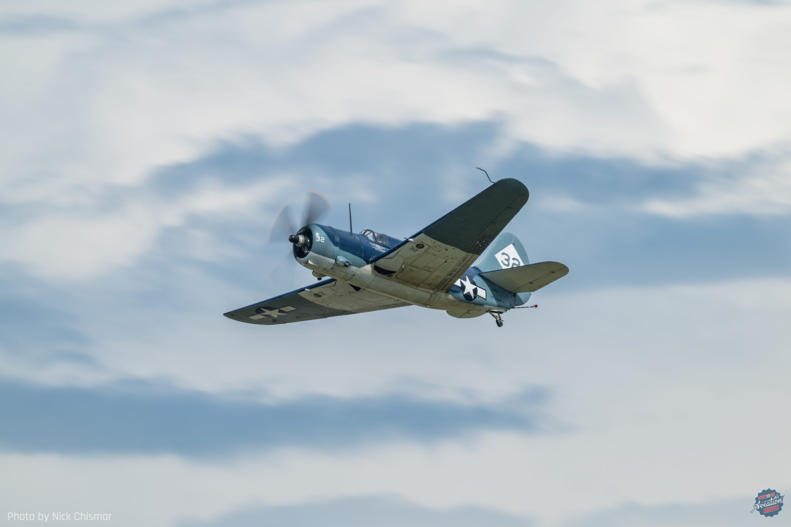 The Skyraider, Zero (a modified T-6), Wildcat, Helldiver, and Corsair launched and made sweeping passes over the airfield. After a few rounds, the Corsair broke formation and returned for a solo display. Piloted by Mark Todd, the gull-winged fighter screamed over the field with vapor trails curling off its wingtips. The iconic whistle of its supercharger echoed over the photo pit.