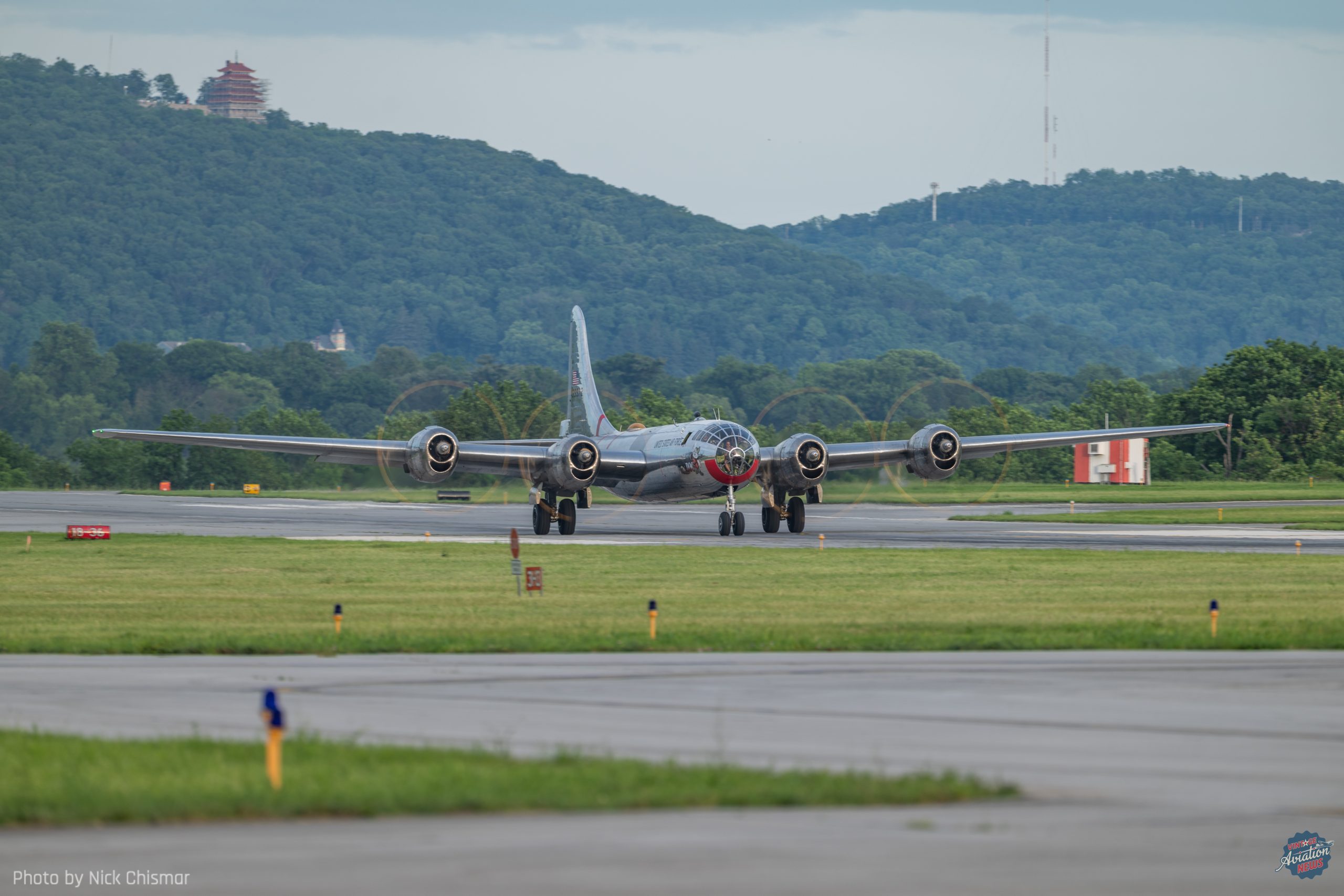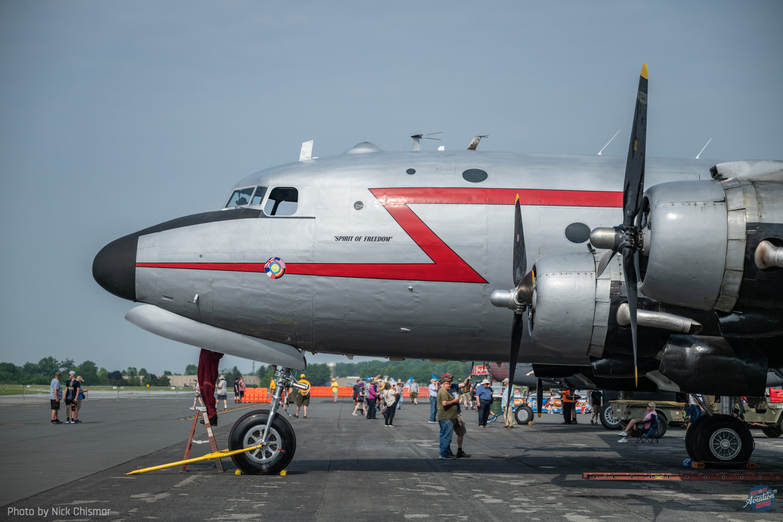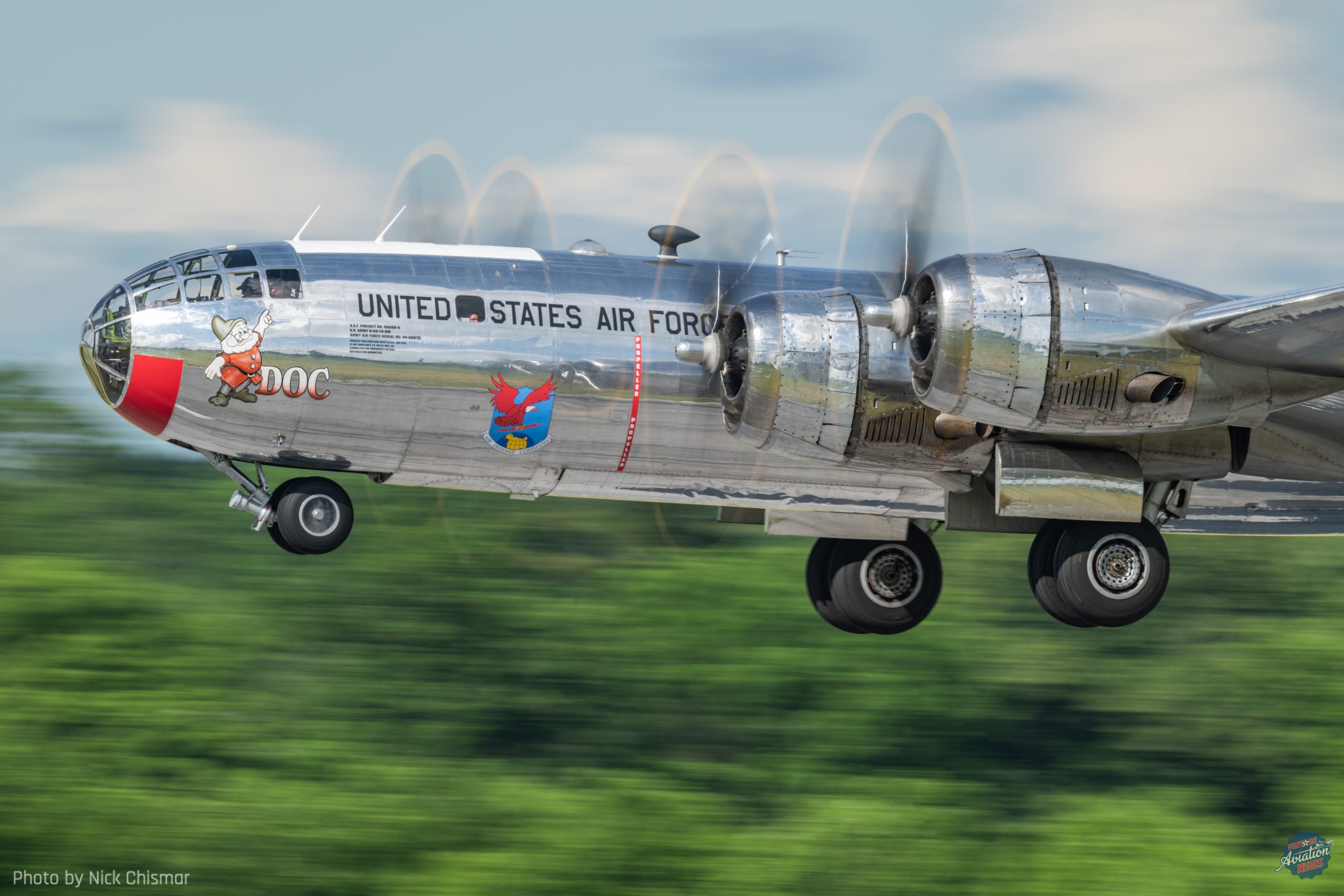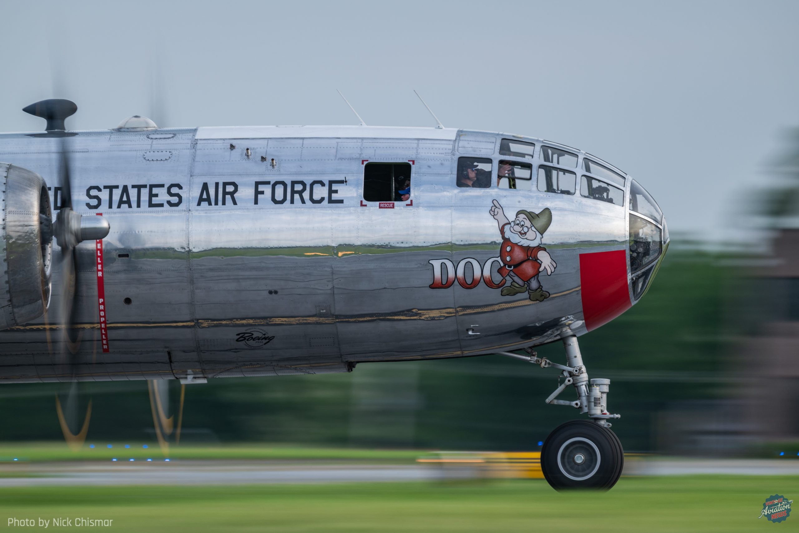 While the airshow portion had yet to begin, ride flights were already in full swing. Spectators gathered at midfield to watch CAF Airbase Georgia’s P-51D and T-6 Texan roar into the sky. Across the airport, the Delaware Aviation Museum’s B-25J Panchito raced past the photo pit, drawing long camera lenses. Then came the unmistakable rumble of a B-29 Superfortress: Doc took off for a ride flight, marking its first appearance at WWII Weekend since 2018—filling in for regular participant Fifi, currently grounded awaiting new engines. Another welcome return was the CAF West Texas Wing’s SB2C Helldiver, also making its first appearance since 2018.