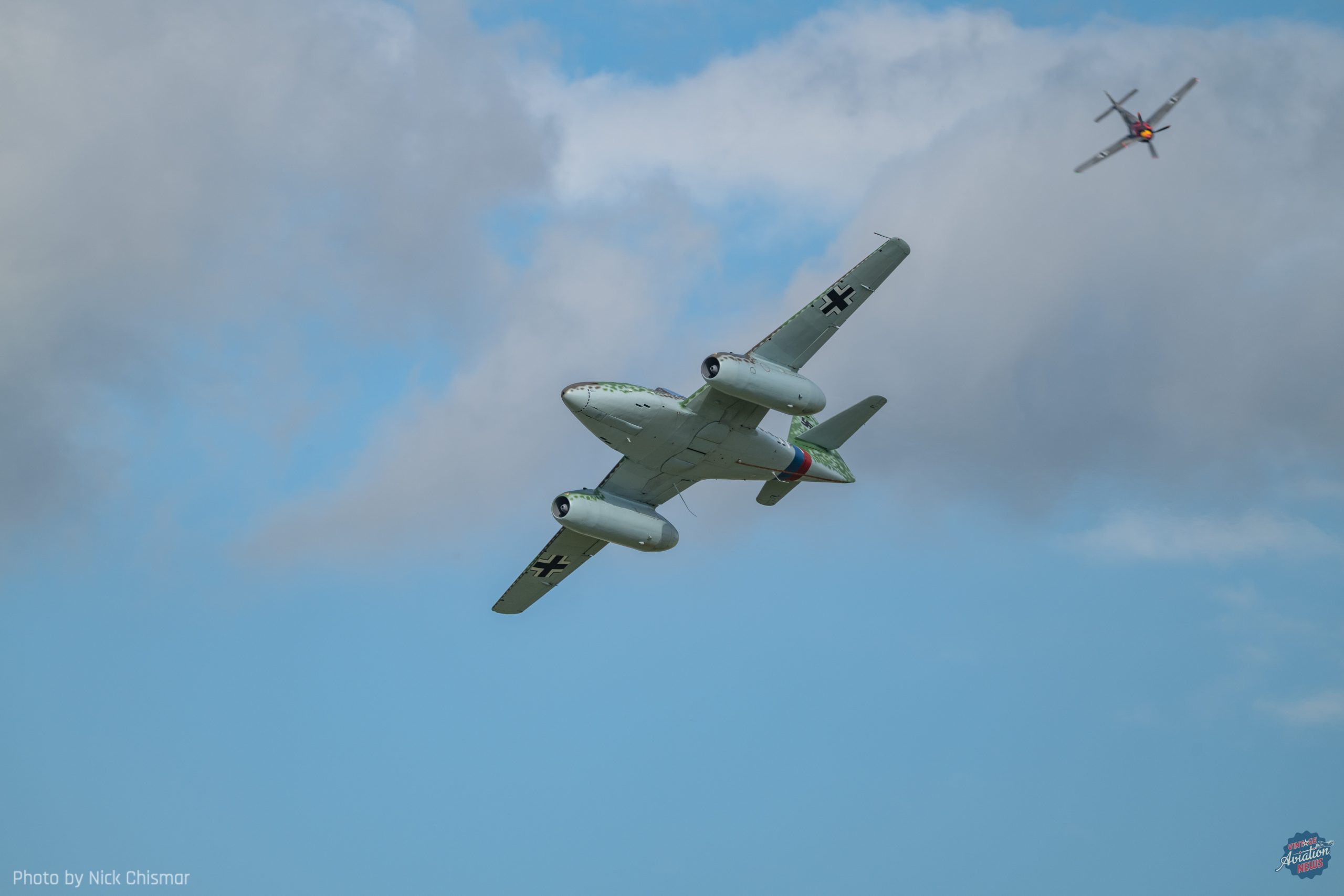 But just around the corner, two aircraft in particular captured the spotlight. Parked near the museum’s legendary P-61 Black Widow were Warren Pietsch’s gleaming P-51C Thunderbird and the Military Aviation Museum’s Me 262—the first time a jet fighter had ever taken part in this event. The crowd was mesmerized, some drawn to Thunderbird‘s deep blue mirror-like finish, others eager to see the Luftwaffe’s iconic jet fighter up close.
