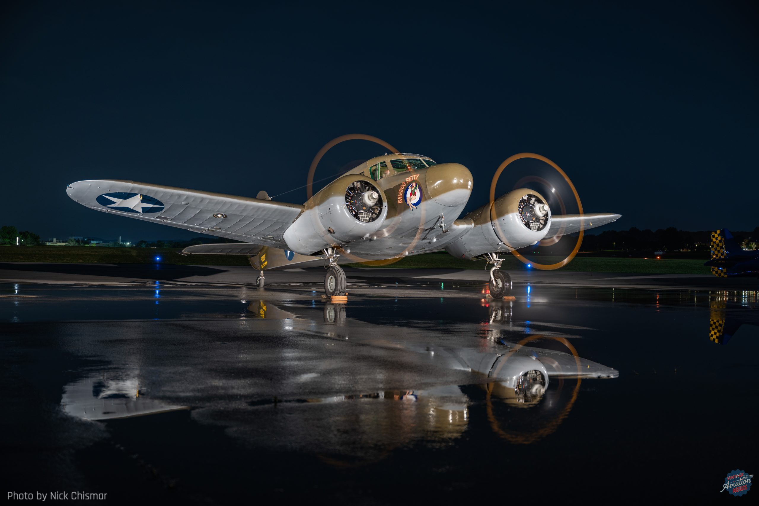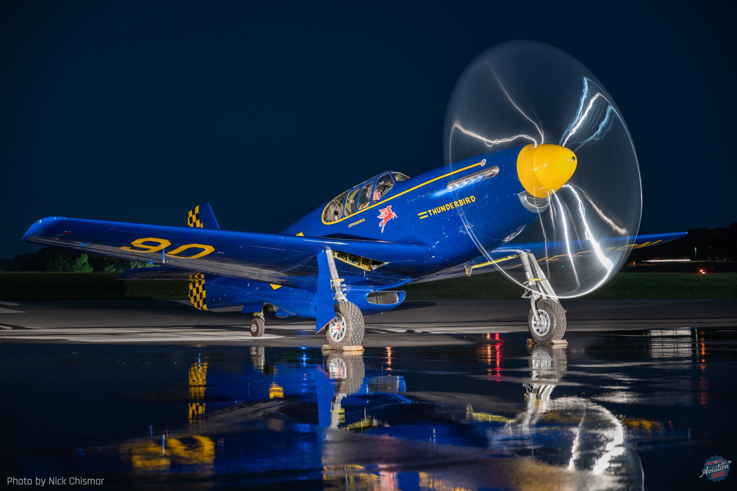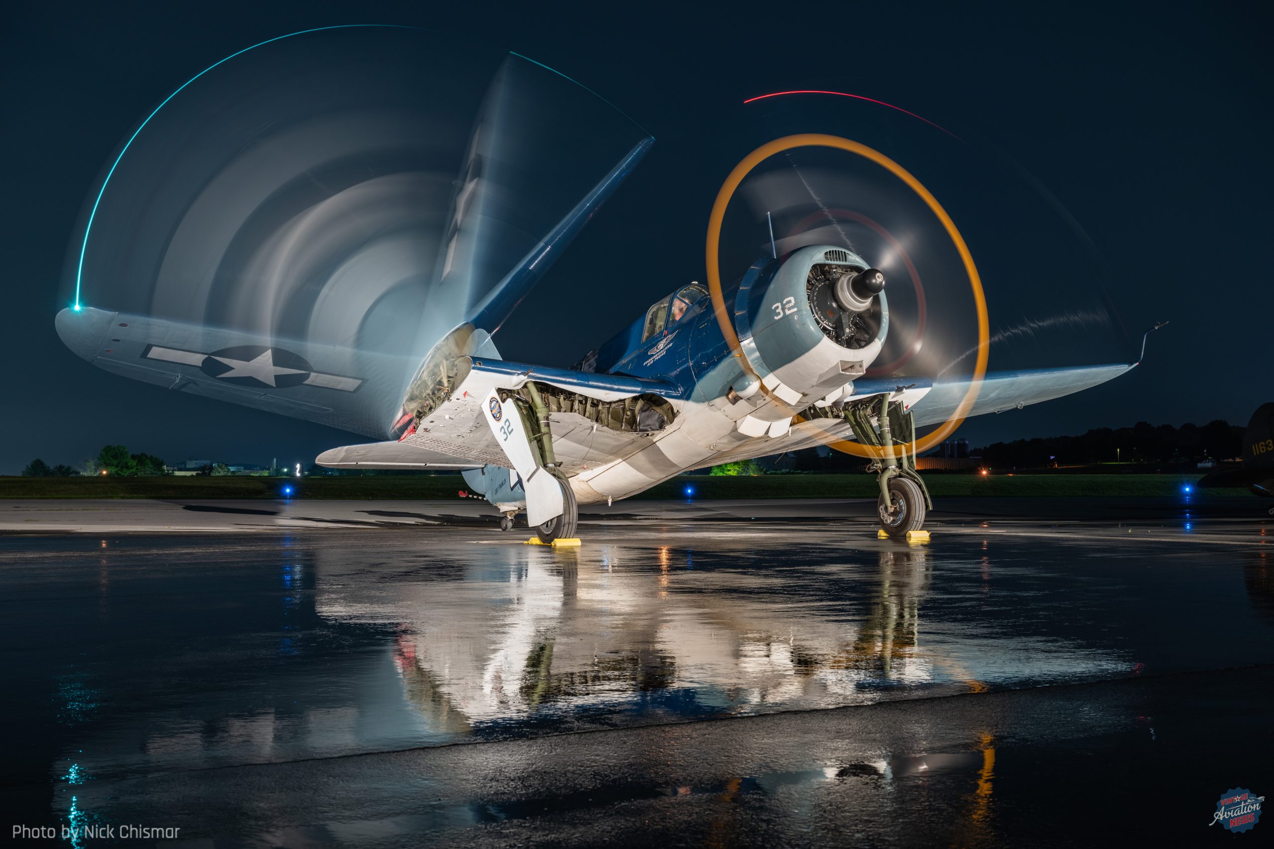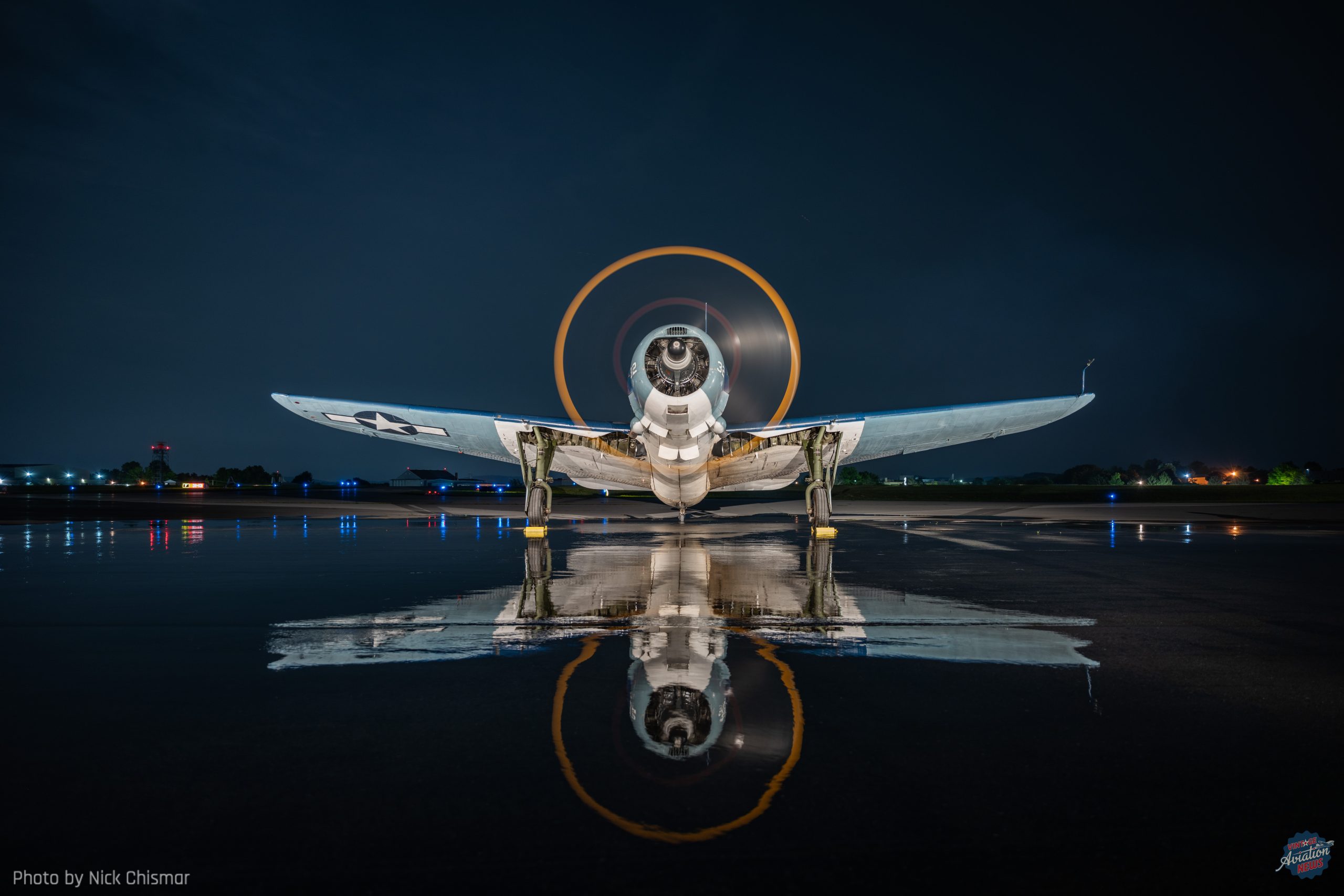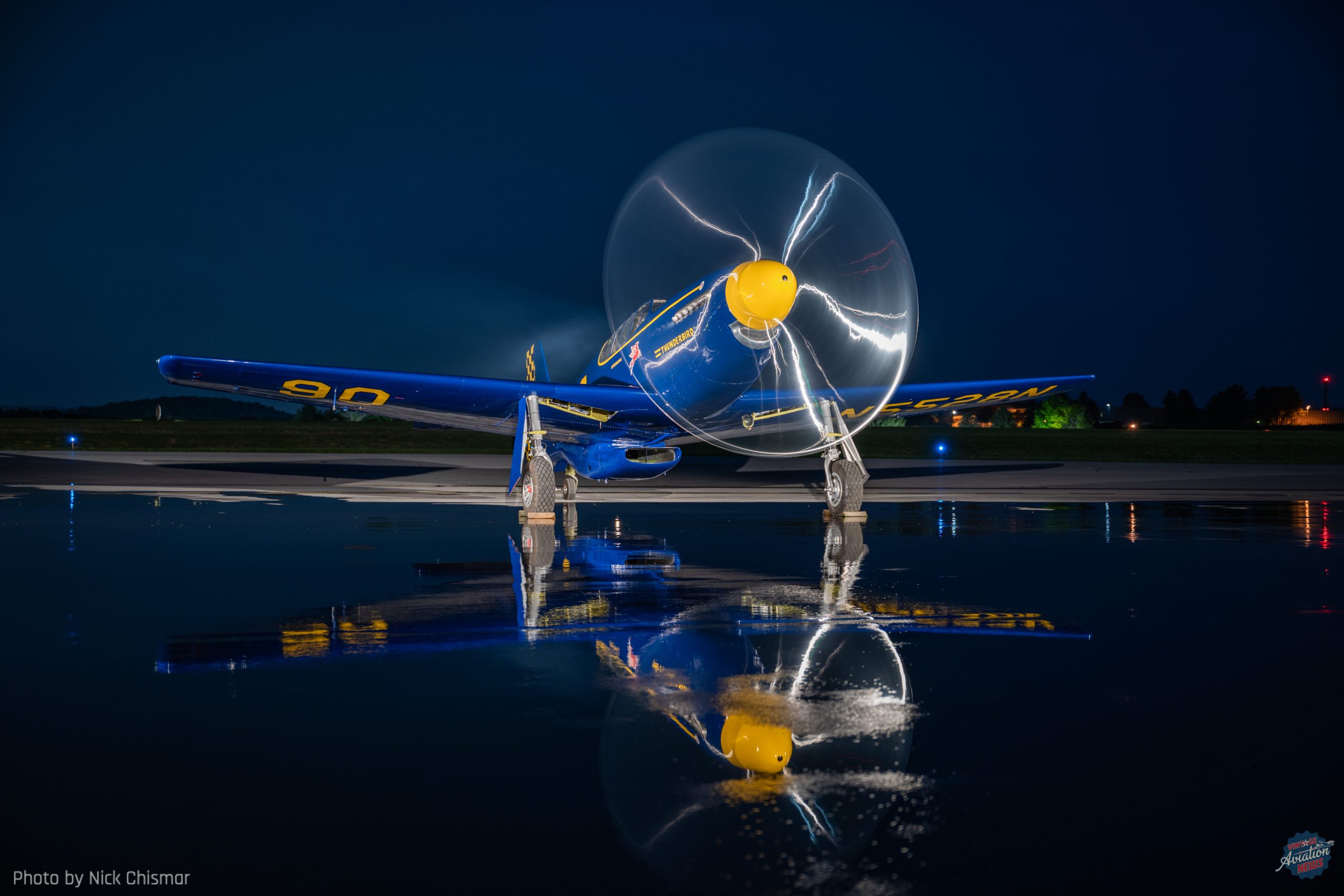 Saturday’s condensed but thrilling show closed with the Corsair taking to the skies one last time for a solemn missing man formation. As the evening continued, the main hangar once again filled for the big dance while photographers returned to the ramp for the night shoot—now in its fifth year. Thunderbird, Bamboo Betty, and the Helldiver were positioned under dramatic lighting provided by Lerro Photography, with water sprayed on the pavement by the Muhlenberg Fire Department to enhance the reflections.