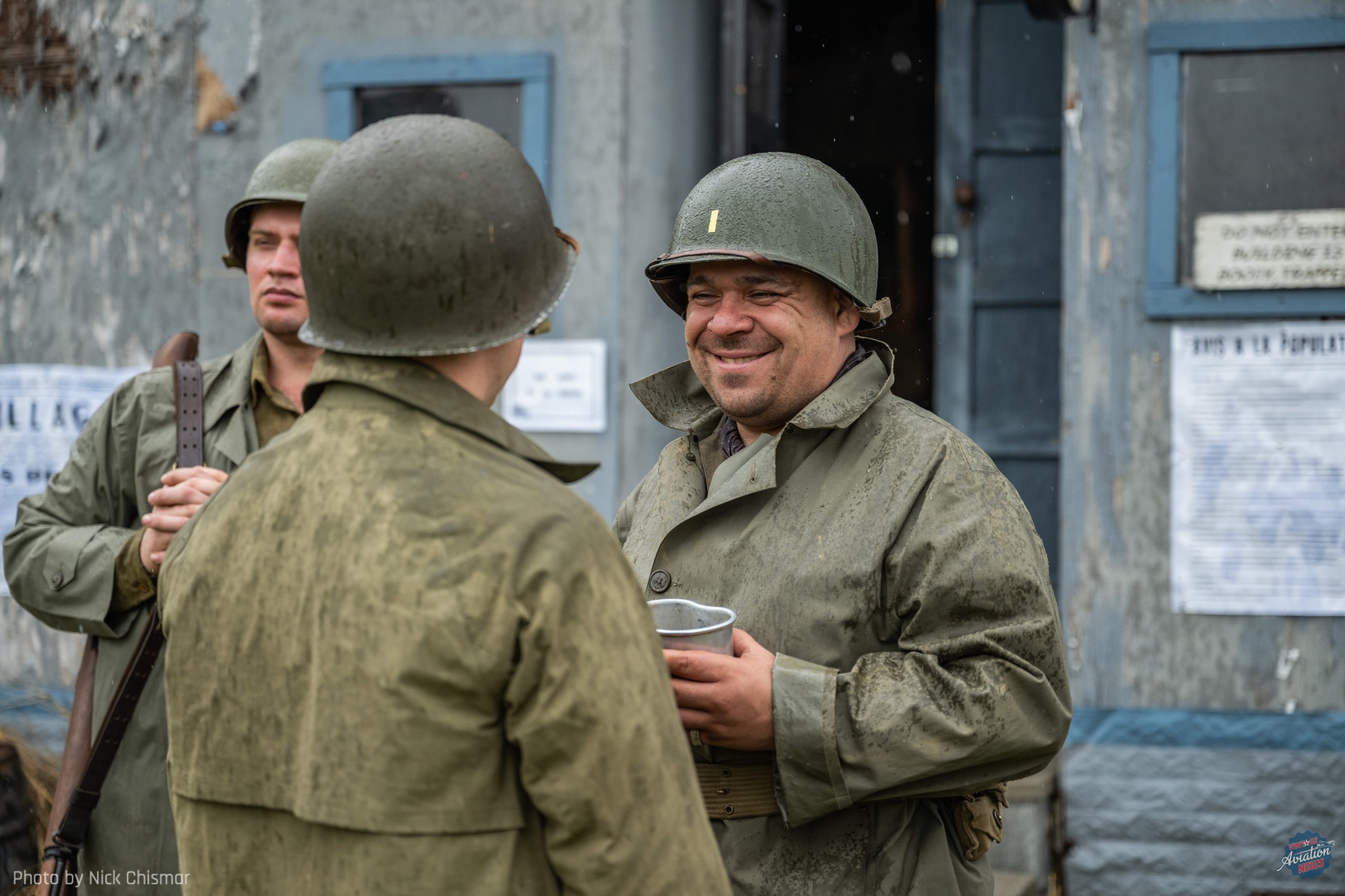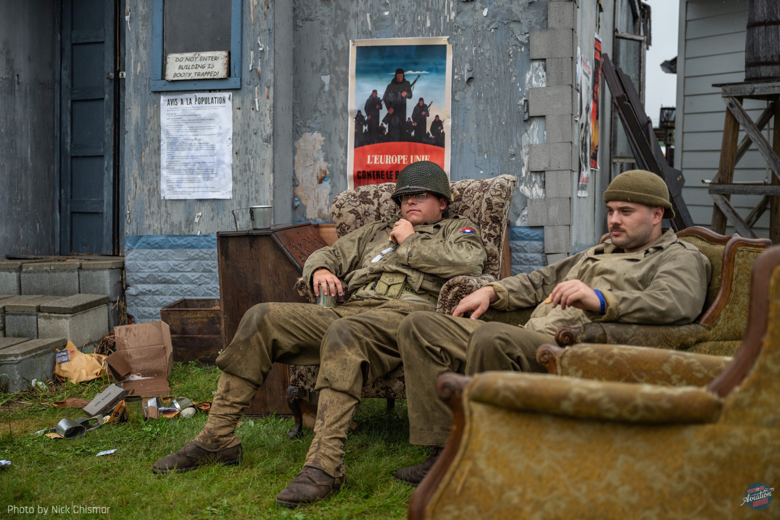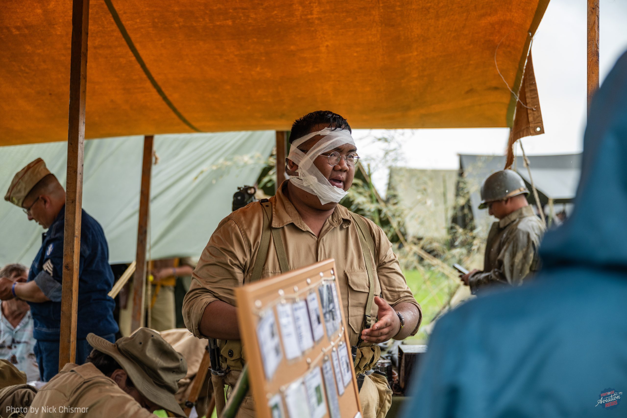 Saturday brought more of the same weather, beginning with hours of steady rain. Despite the grounded aircraft, crowds still poured in. As many say, WWII Weekend is more than just an airshow. Reenactors carried on through the rain, engaging with visitors, staging mock battles, and showcasing living history across the village and encampments. Visitors spoke with pilots, toured the aircraft, and gathered in the main hangar to hear stories from WWII veterans—often considered the most meaningful part of the event.