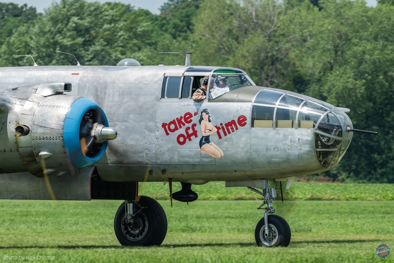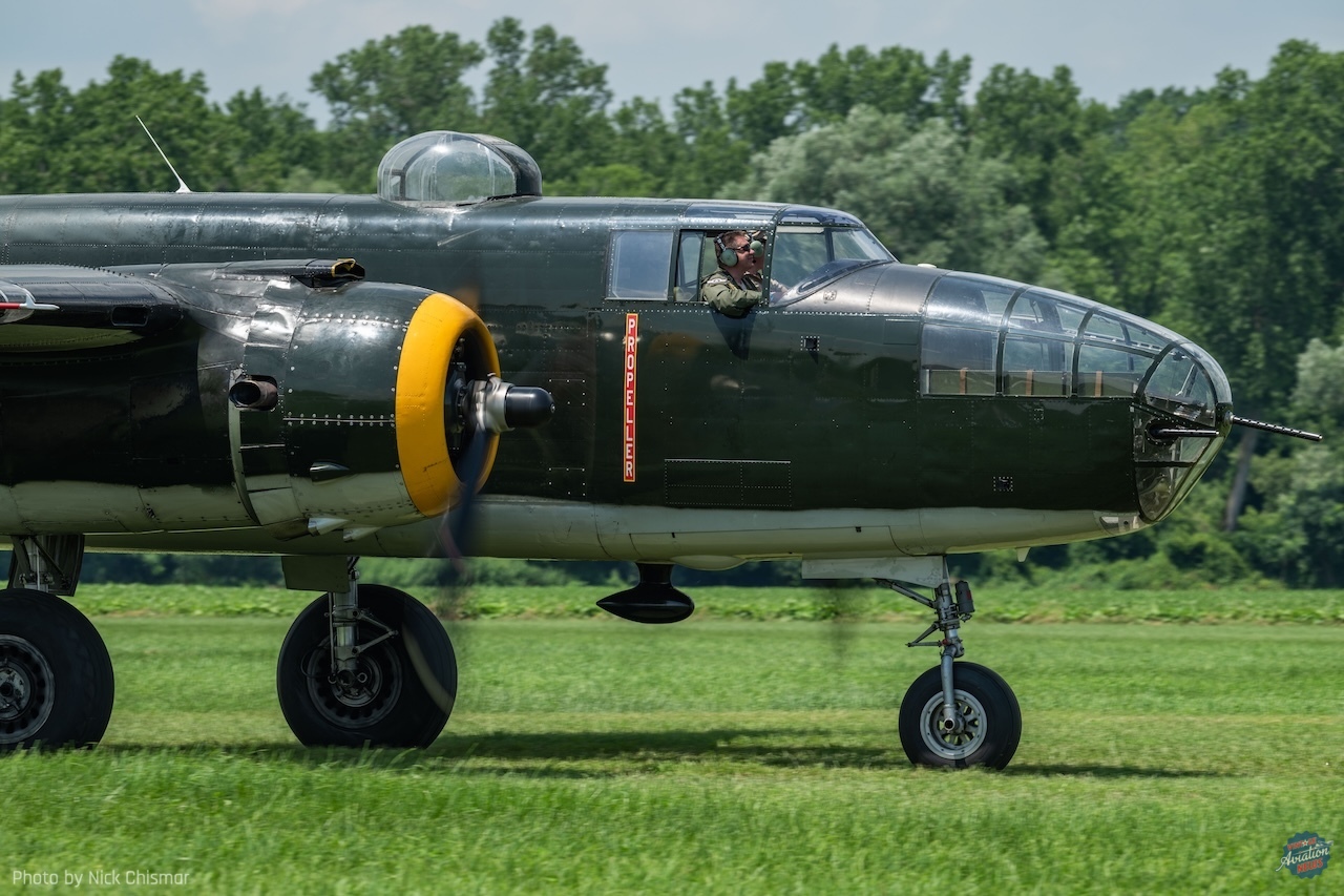 As the main airshow drew to a close, the sounds of engines spooling up again filled the field. Lou Horschel launched in his FG-1D Corsair, followed by three P-51s, the CAF Corsair, and both B-25s for a special tribute flyover in memory of Rob Holland. The fighters passed multiple times in formation while the B-25s approached from behind, creating a powerful and emotional finale.
