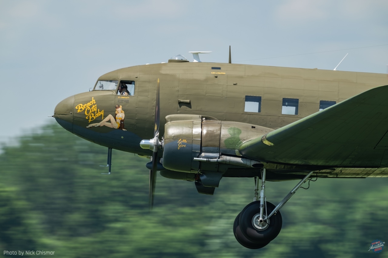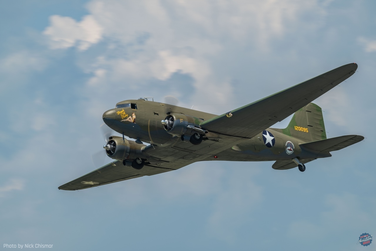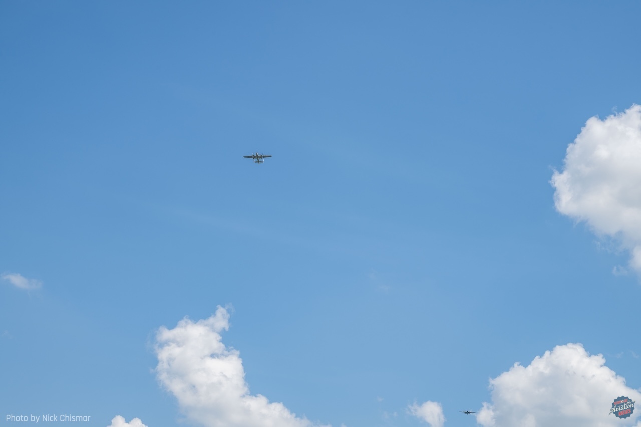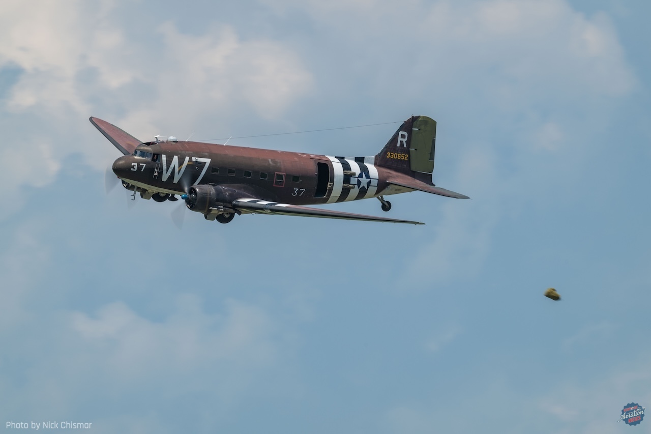 The “heavies” were next to fly, with three C-47 Skytrains—“W7,” “Placid Lassie,” and the C-53 “Beach City Baby”—launching for their own displays. Following one of the jet demos, the trio returned with sweeping passes over the crowd before “W7” conducted a cargo drop, reminiscent of operations over “The Hump” in the China-Burma-India Theater.