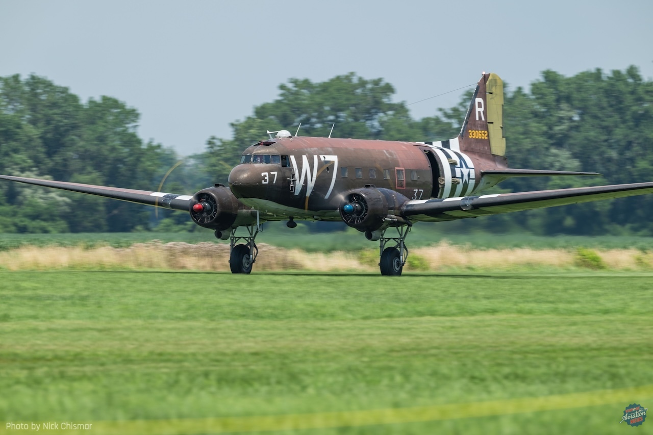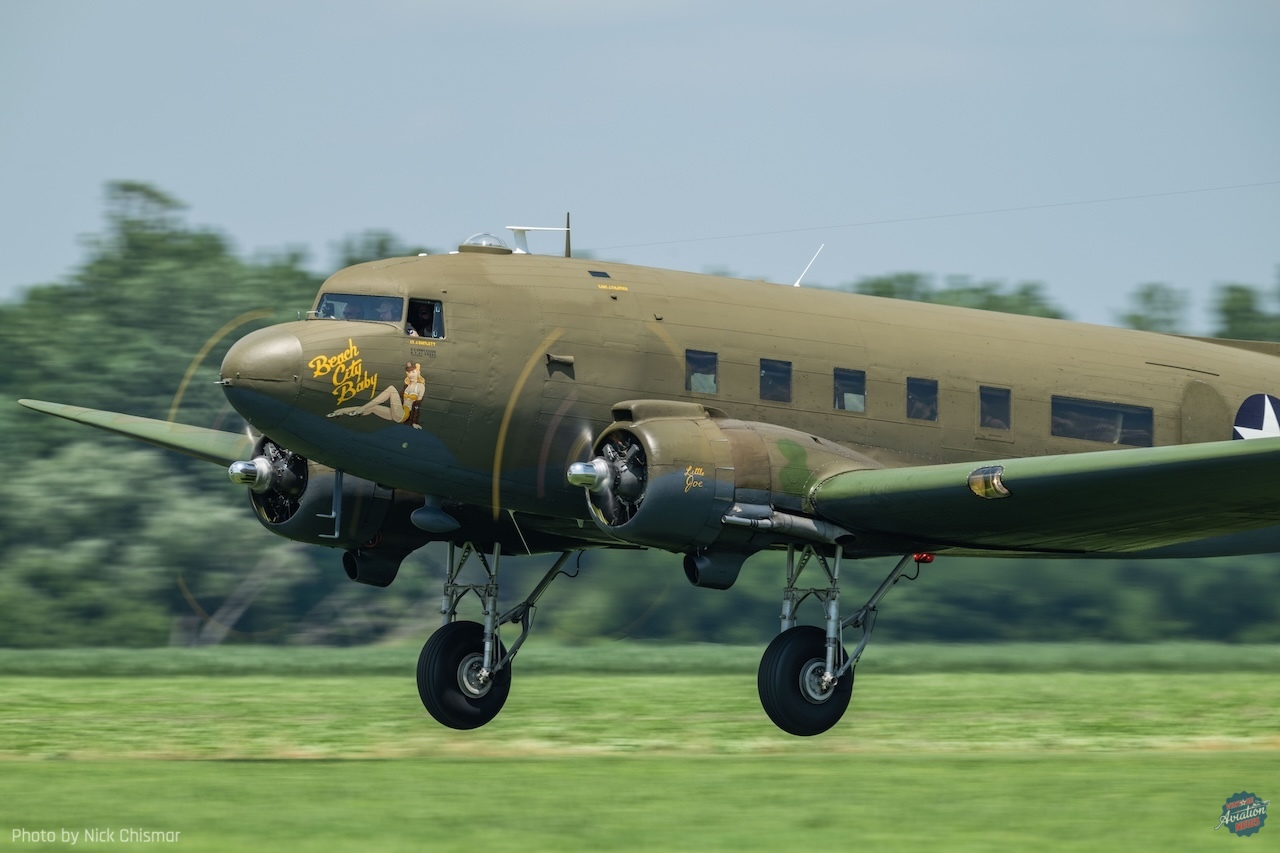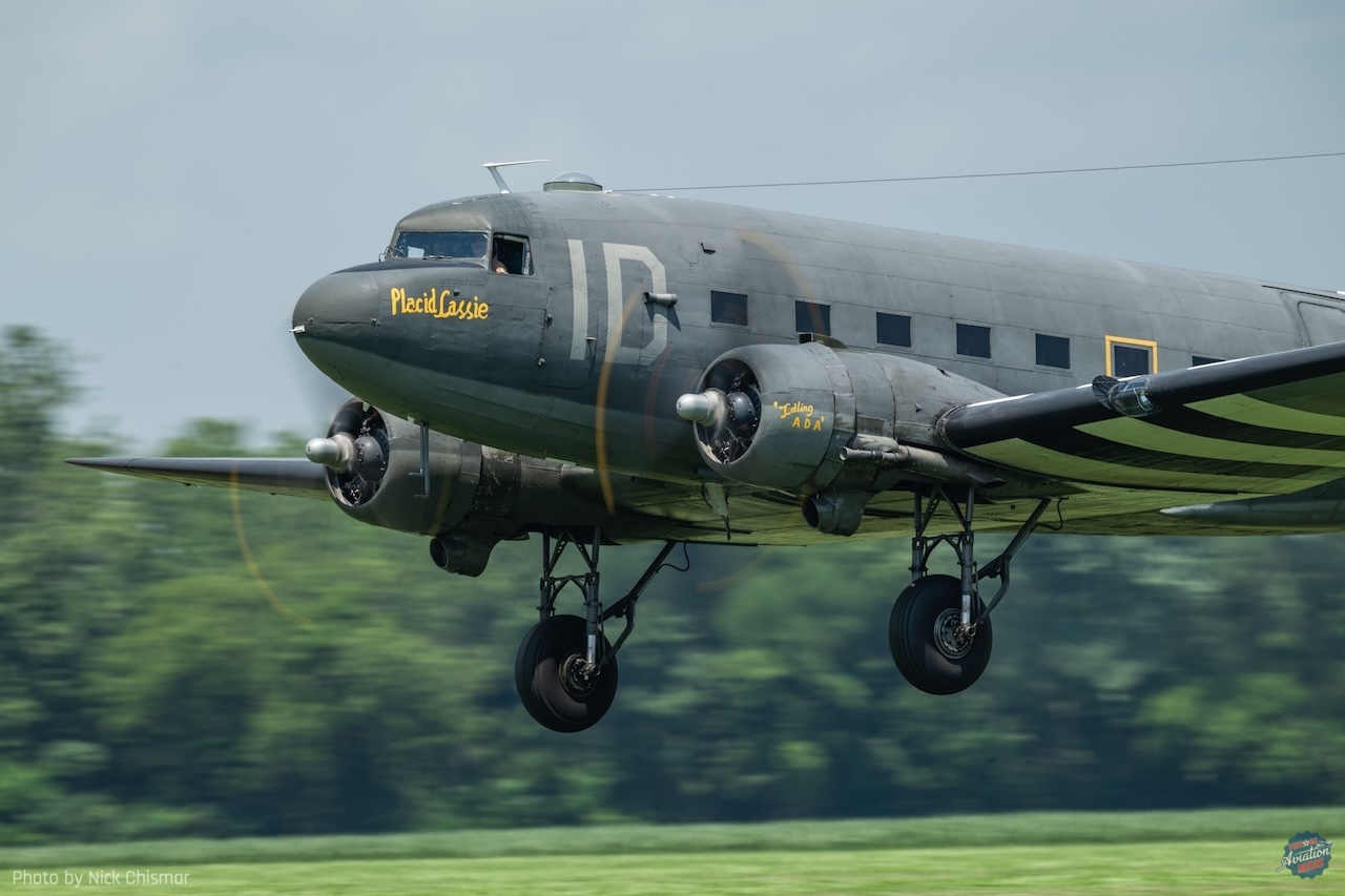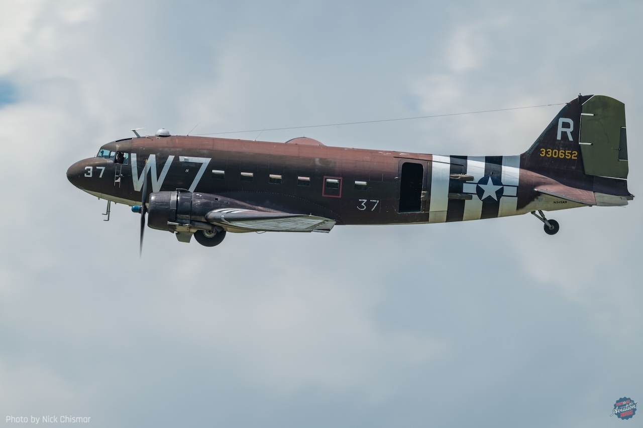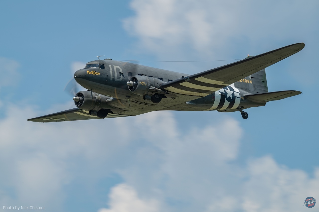 The “heavies” were next to fly, with three C-47 Skytrains—“W7,” “Placid Lassie,” and the C-53 “Beach City Baby”—launching for their own displays. Following one of the jet demos, the trio returned with sweeping passes over the crowd before “W7” conducted a cargo drop, reminiscent of operations over “The Hump” in the China-Burma-India Theater.