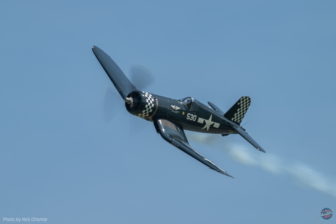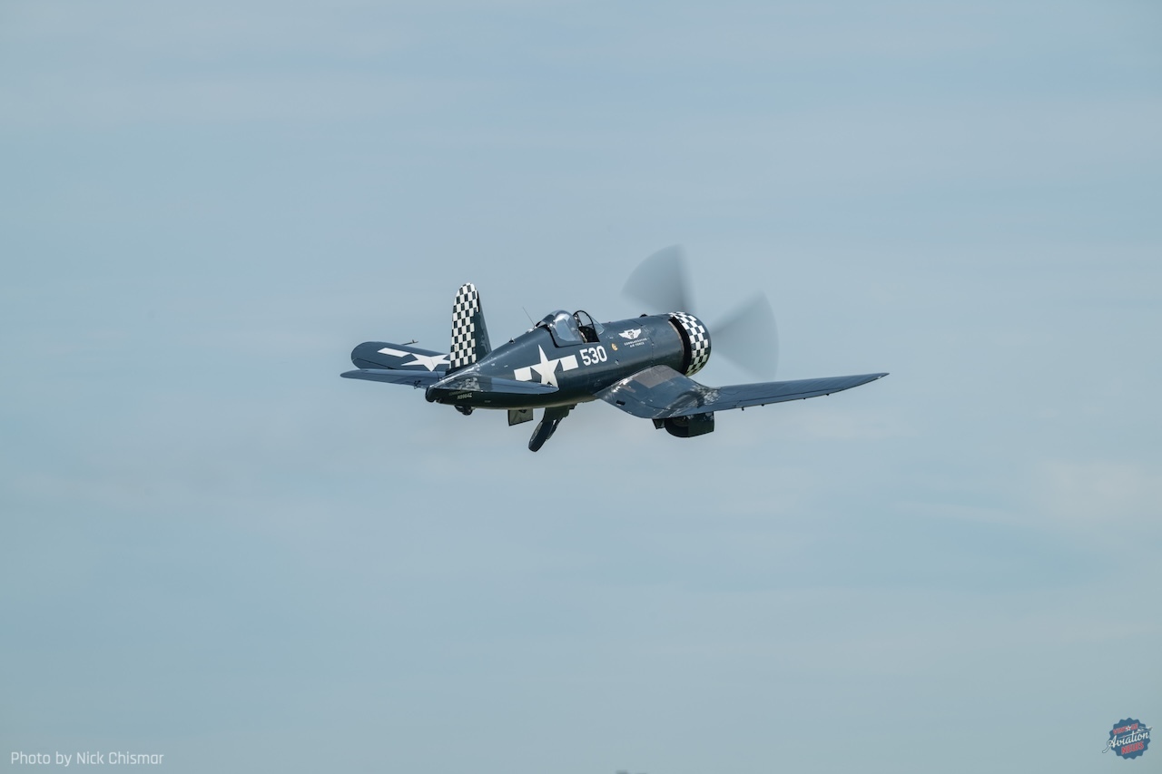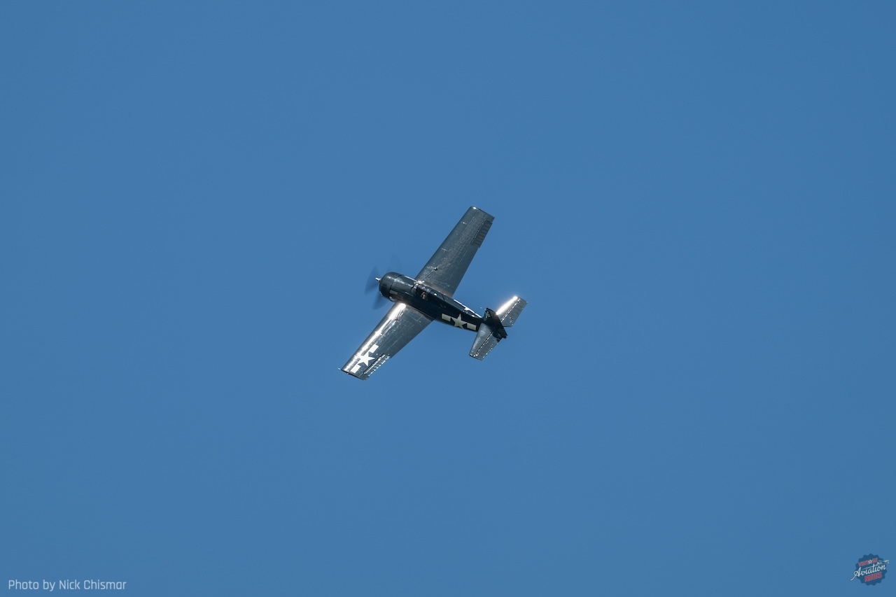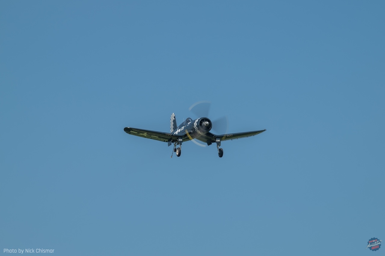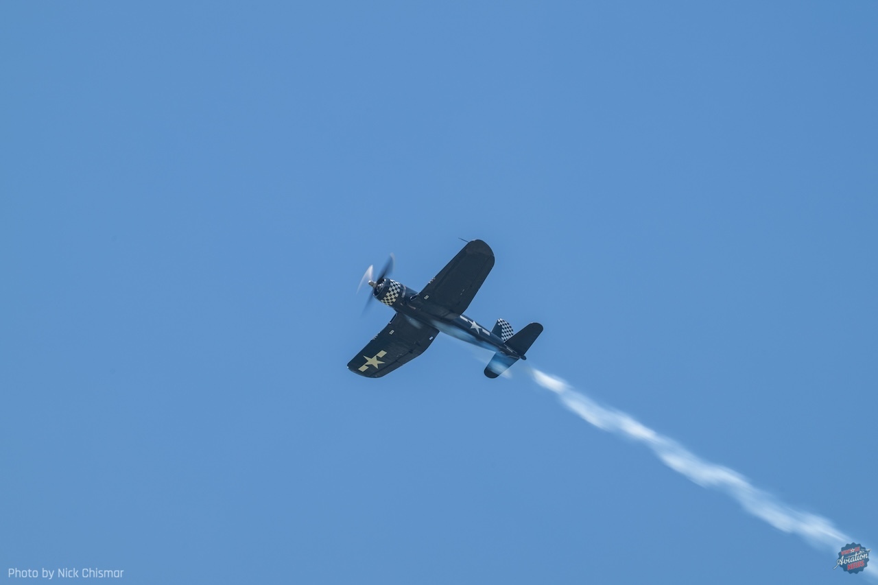 As Thom concluded his performance with a series of photo passes, CAF Airbase Georgia’s FG-1D Corsair began its takeoff roll. However, before the Corsair’s display, Trevor Rafferty took off in his Pitts Model 12. Unfortunately, a technical issue appeared during takeoff, prompting Trevor to safely return to the pattern and land shortly after. Although the crowd missed out on his trademark aerobatics, safety remained the top priority. With Trevor safely back on the ground, CAF Airbase Georgia’s Corsair came screaming in from the show right. The size, sound, and presence of the aircraft never fail to impress. A crowd favorite is always the “dirty pass” or “carrier approach,” in which the gear, flaps, and tailhook are deployed for a slow, dramatic flyby.
