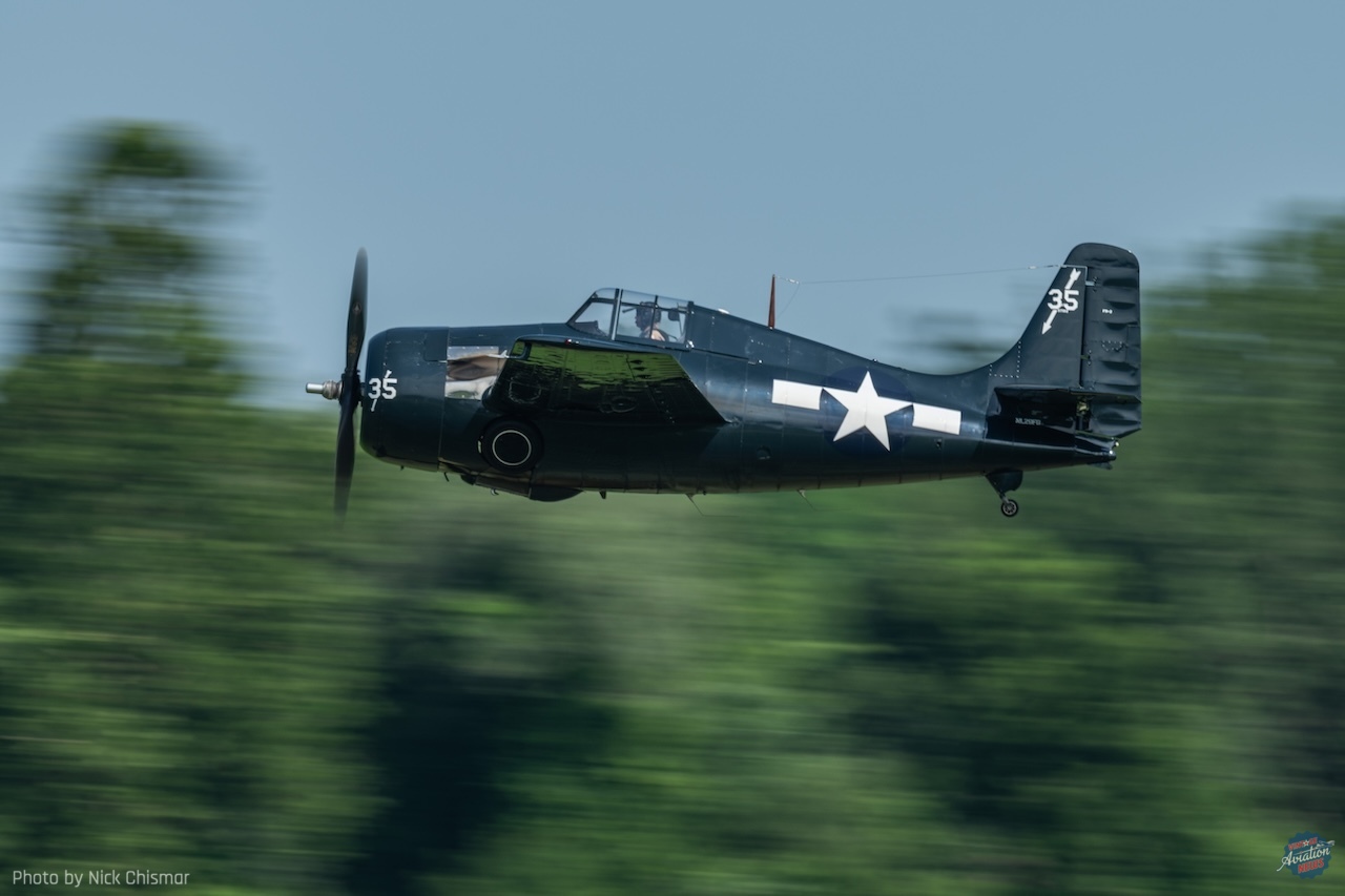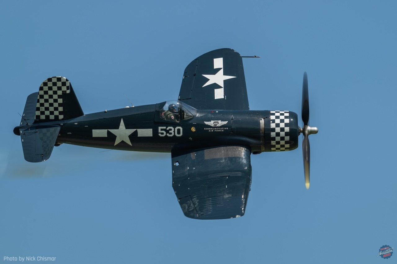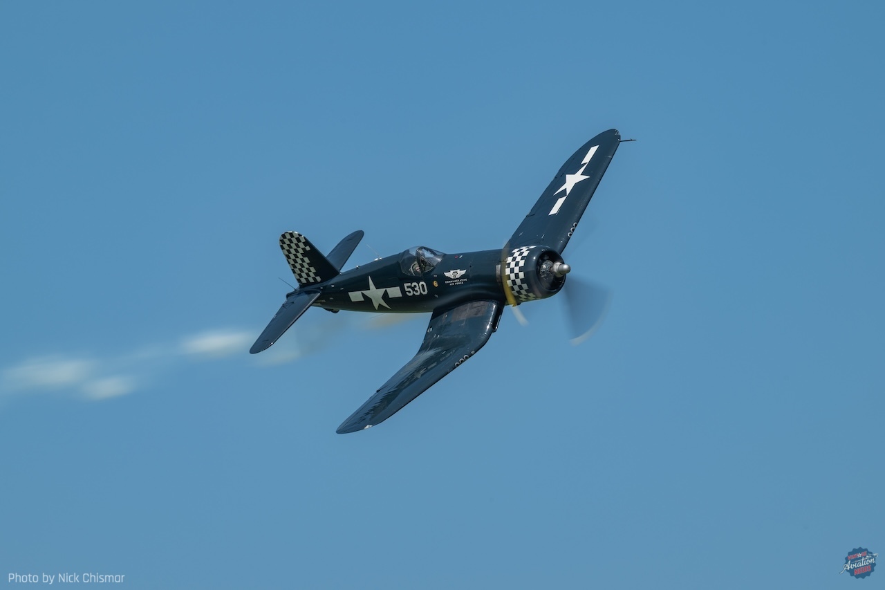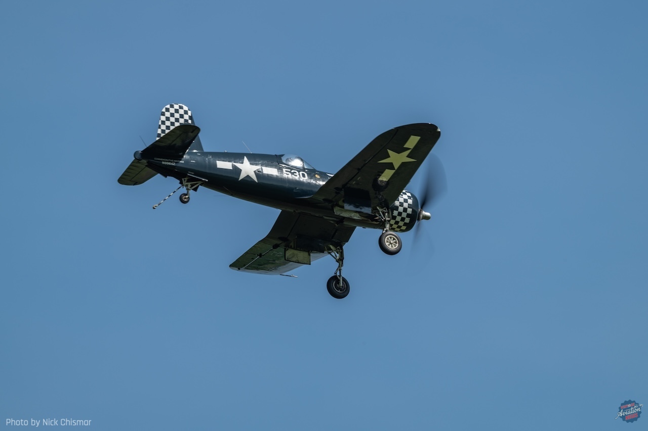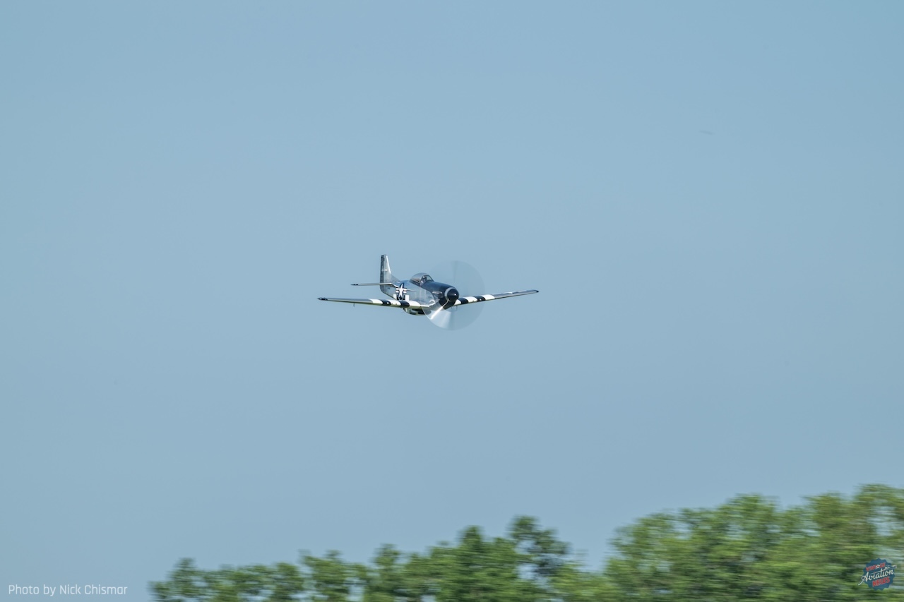 As Thom concluded his performance with a series of photo passes, CAF Airbase Georgia’s FG-1D Corsair began its takeoff roll. However, before the Corsair’s display, Trevor Rafferty took off in his Pitts Model 12. Unfortunately, a technical issue appeared during takeoff, prompting Trevor to safely return to the pattern and land shortly after. Although the crowd missed out on his trademark aerobatics, safety remained the top priority. With Trevor safely back on the ground, CAF Airbase Georgia’s Corsair came screaming in from the show right. The size, sound, and presence of the aircraft never fail to impress. A crowd favorite is always the “dirty pass” or “carrier approach,” in which the gear, flaps, and tailhook are deployed for a slow, dramatic flyby.