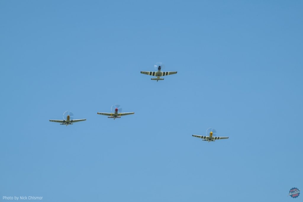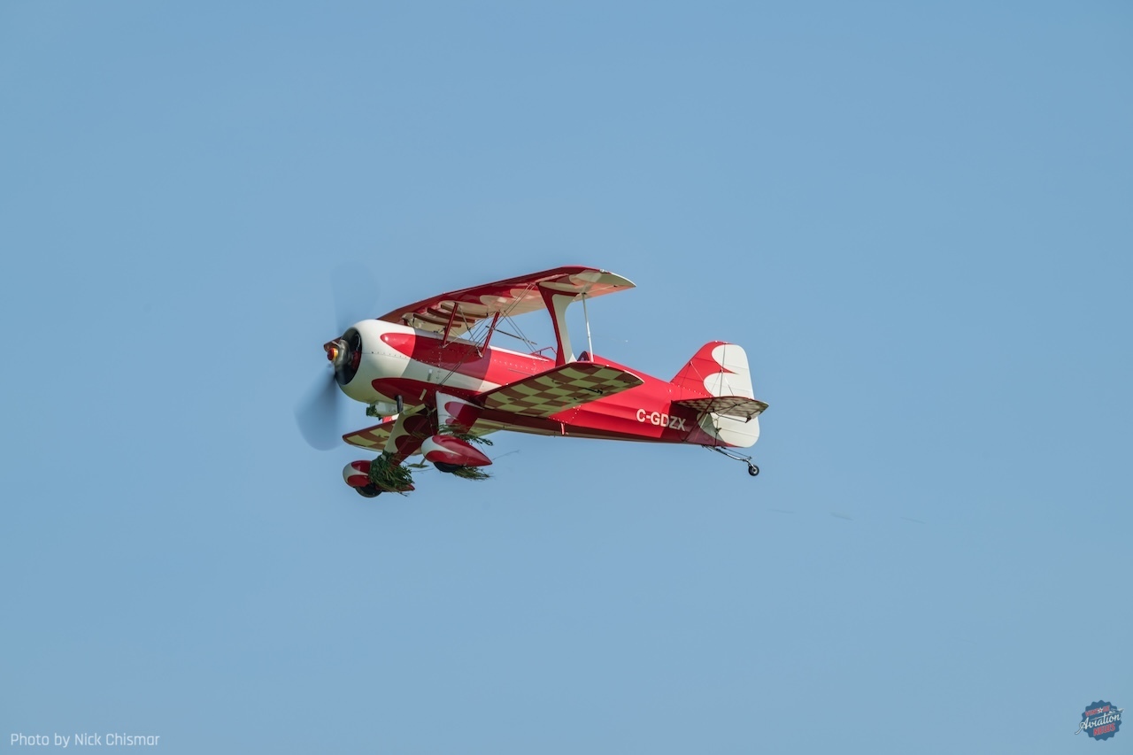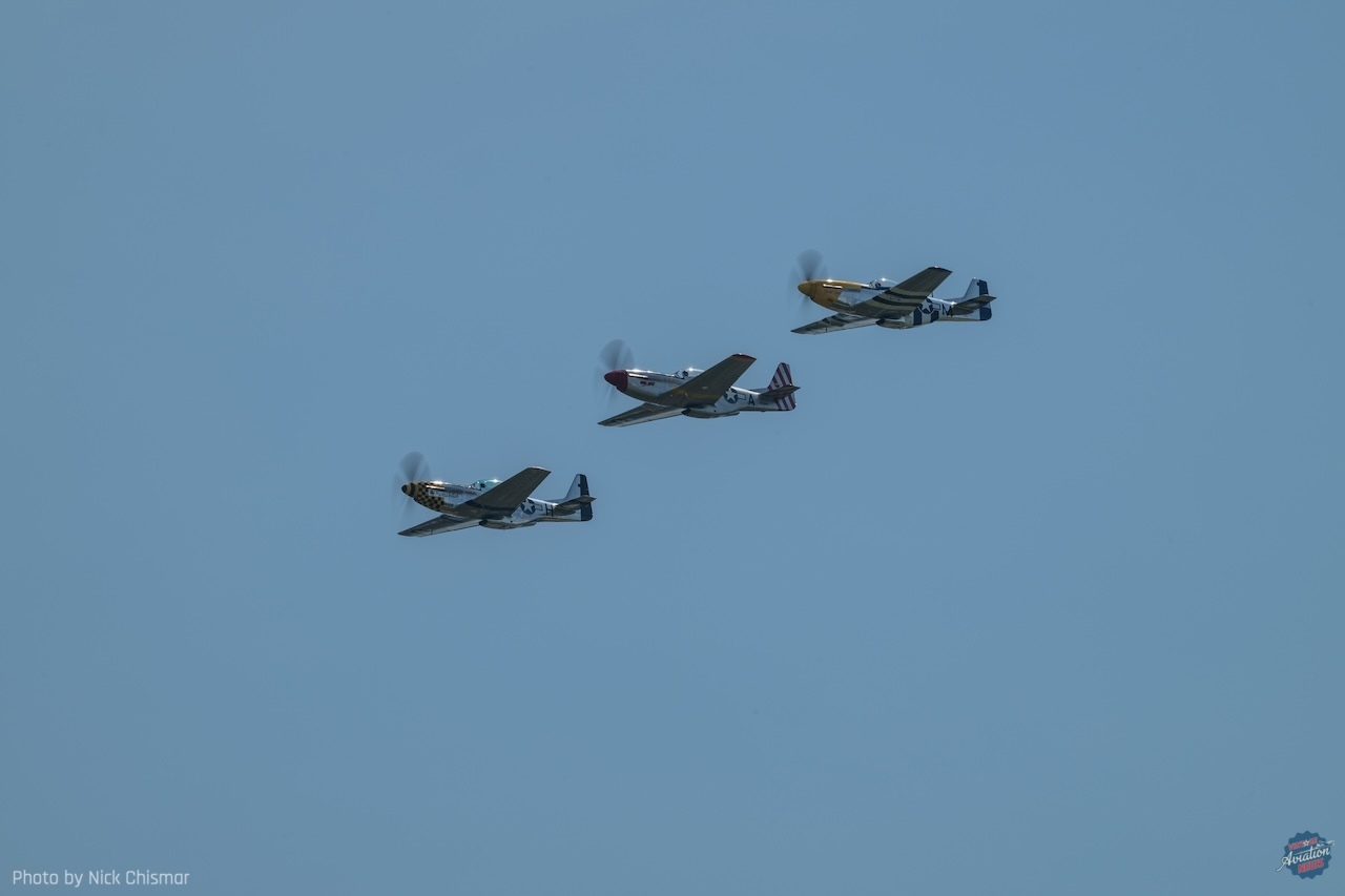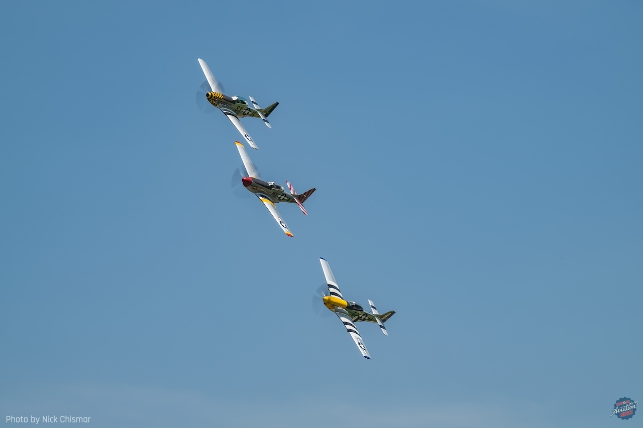 The official show opening featured a flag jump with both the Canadian and American flags dropped from the museum’s own C-47 “W7.” Soon after, four P-51s began their takeoff roll. Forming up over the field, the three P-51s of the Jack Aces were joined by Scott Yoak to perform a solemn missing man formation in honor of longtime performer and aviation legend Rob Holland.