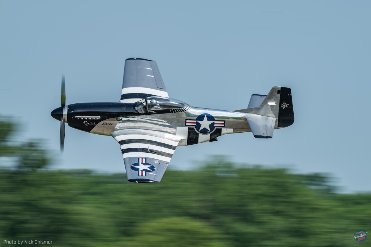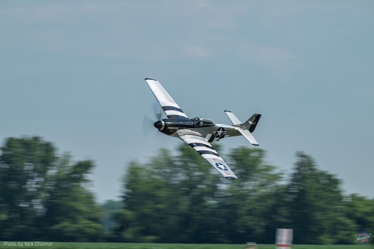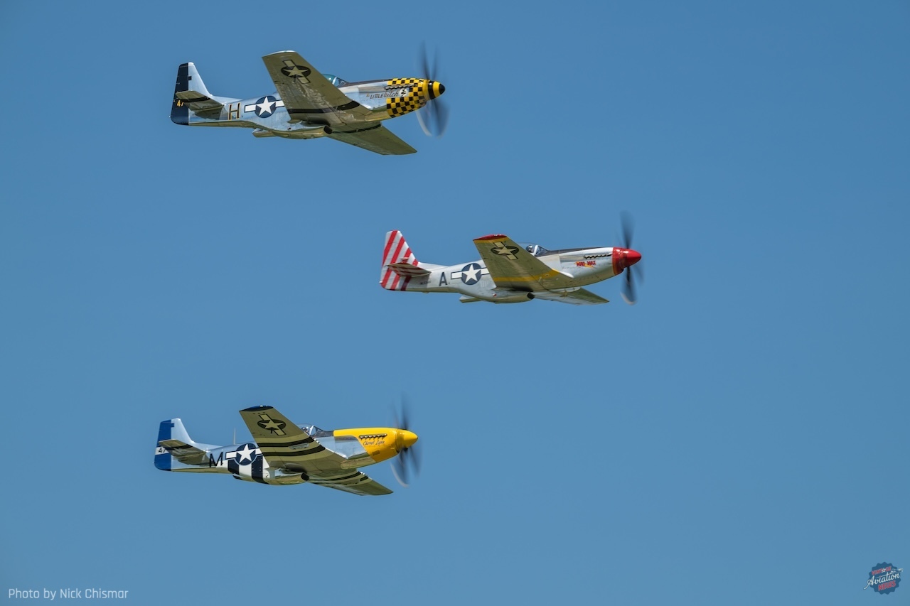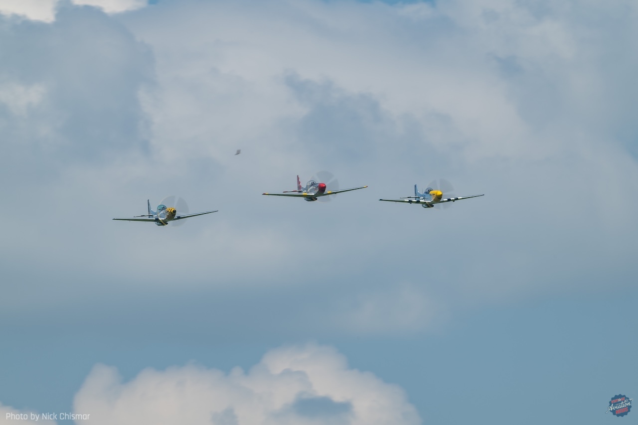 The official show opening featured a flag jump with both the Canadian and American flags dropped from the museum’s own C-47 “W7.” Soon after, four P-51s began their takeoff roll. Forming up over the field, the three P-51s of the Jack Aces were joined by Scott Yoak to perform a solemn missing man formation in honor of longtime performer and aviation legend Rob Holland.