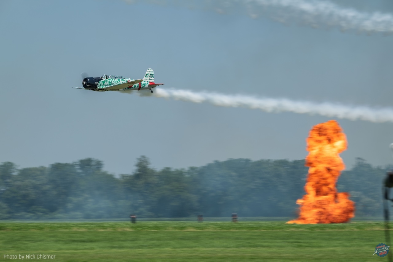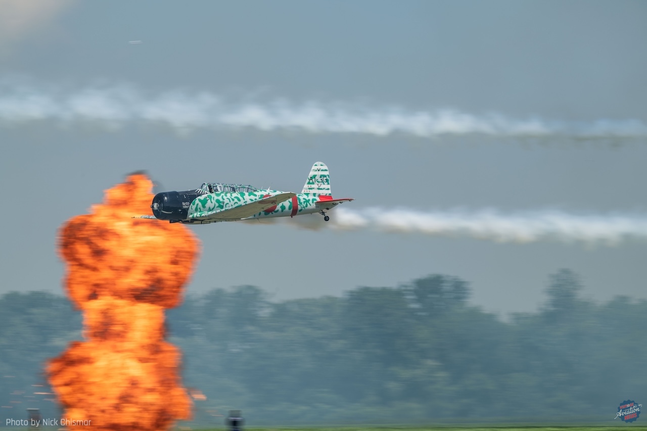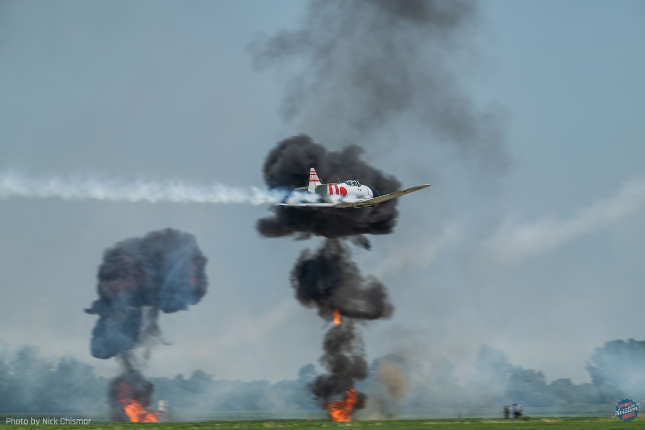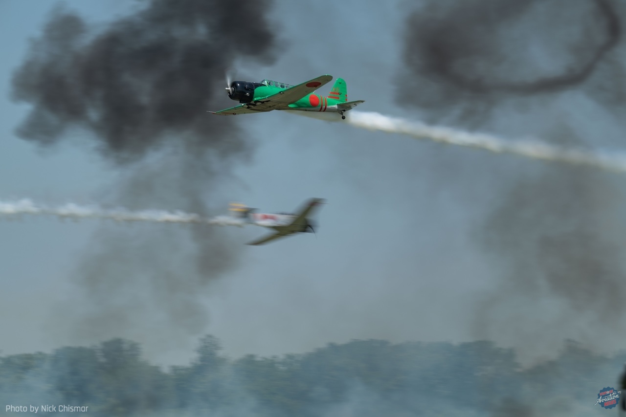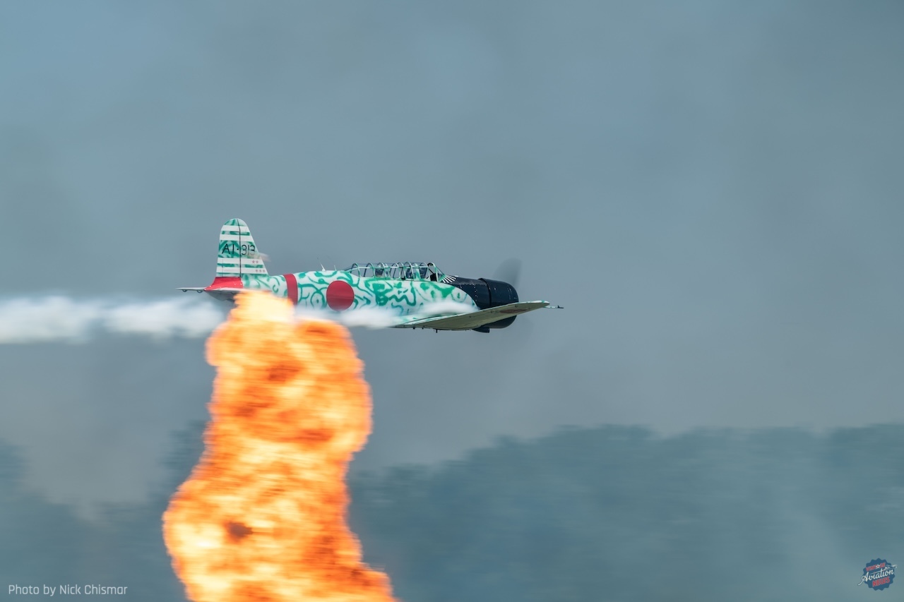 A variety of WWII-era trainers also flew throughout the day, including several T-6s, a BT-13, and a historically significant aircraft that was on the ground in Honolulu during the attack on Pearl Harbor. It was then that air raid sirens sounded, and aircraft began to approach from behind the crowd. Breaking formation in all directions, the CAF’s Tora! Tora! Tora! reenactment of the Pearl Harbor attack was underway. Featuring smoke, pyrotechnics, and carefully choreographed flight paths, the display captivated the audience. For many, it was the first time witnessing such a large number of aircraft in a single, coordinated reenactment. After each performer made a final photo pass, they regrouped for a final spectacle—the iconic “Wall of Fire.”