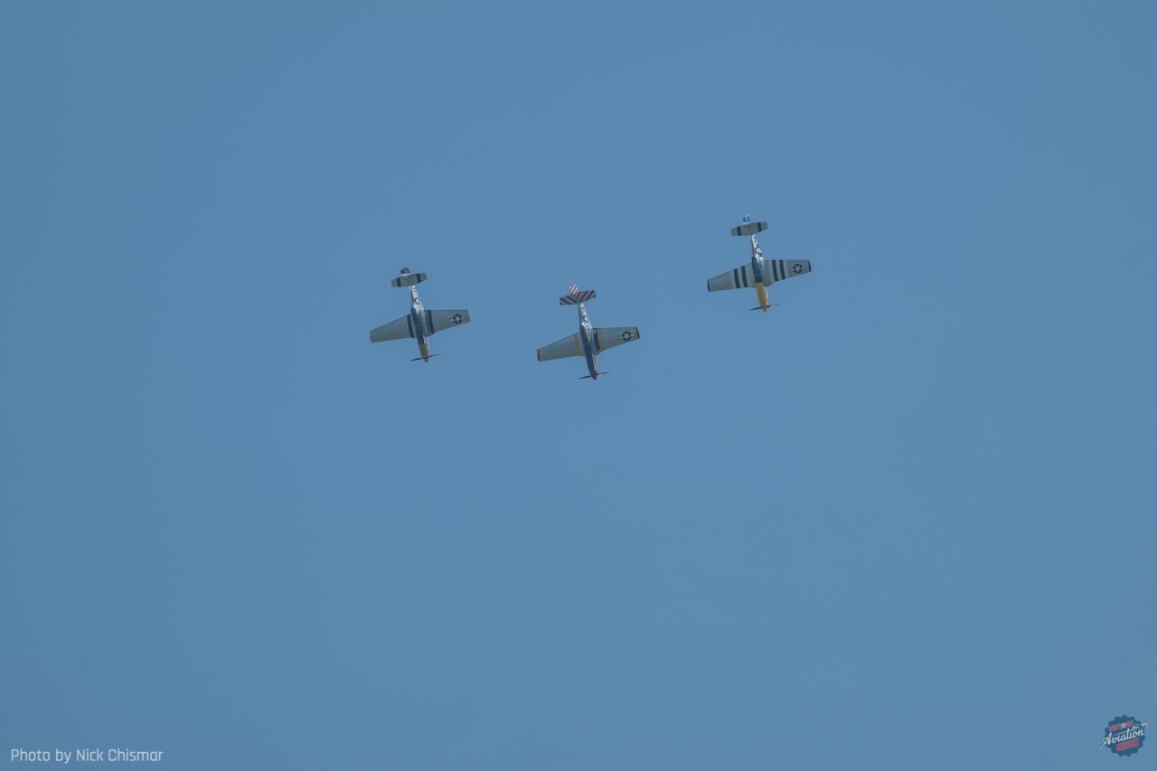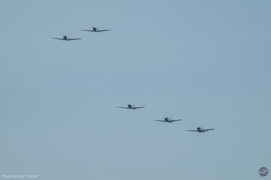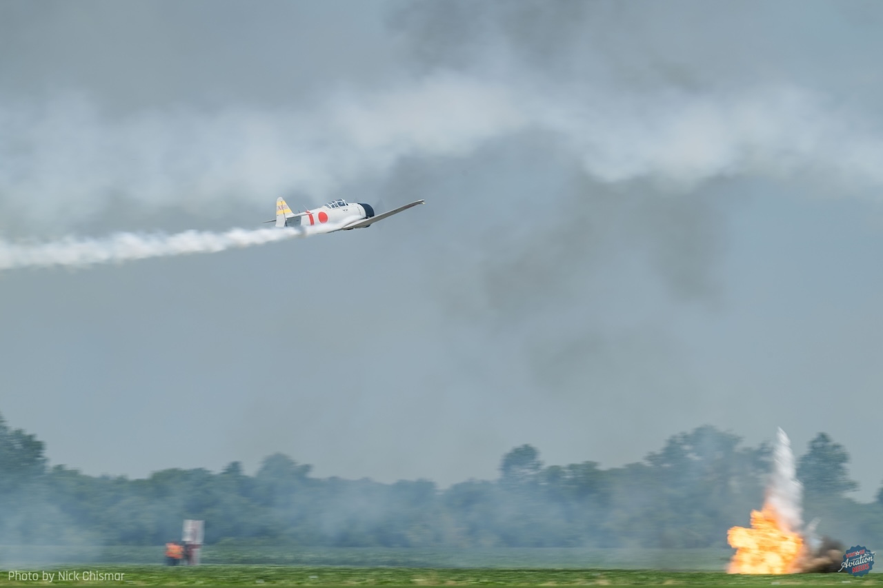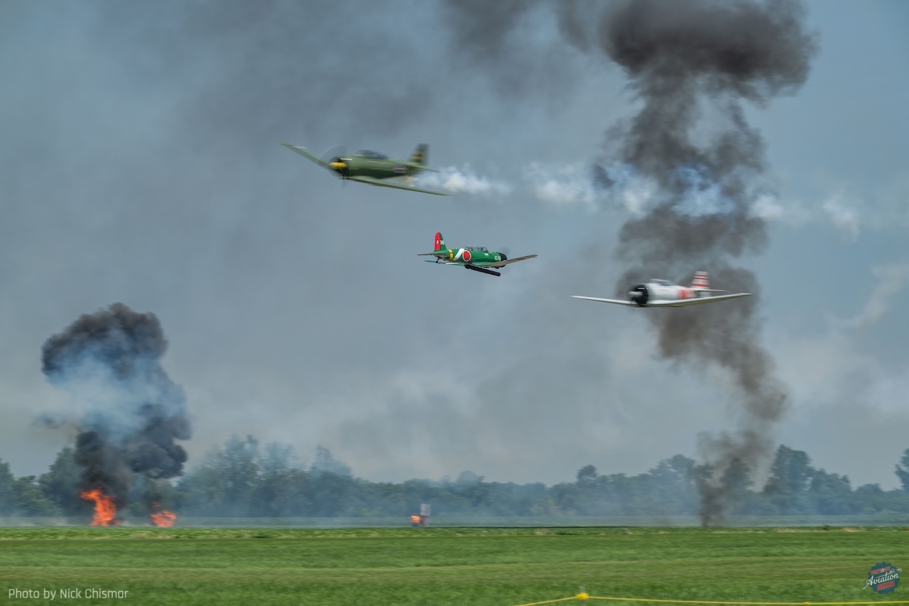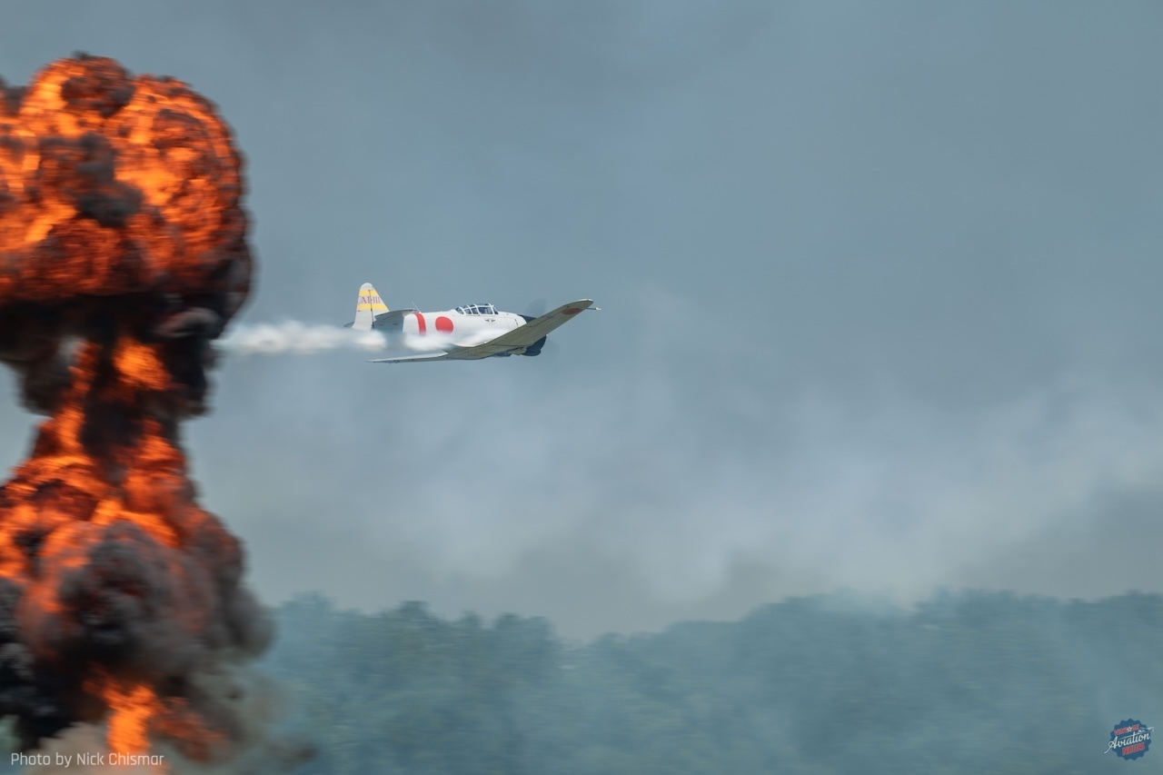 A variety of WWII-era trainers also flew throughout the day, including several T-6s, a BT-13, and a historically significant aircraft that was on the ground in Honolulu during the attack on Pearl Harbor. It was then that air raid sirens sounded, and aircraft began to approach from behind the crowd. Breaking formation in all directions, the CAF’s Tora! Tora! Tora! reenactment of the Pearl Harbor attack was underway. Featuring smoke, pyrotechnics, and carefully choreographed flight paths, the display captivated the audience. For many, it was the first time witnessing such a large number of aircraft in a single, coordinated reenactment. After each performer made a final photo pass, they regrouped for a final spectacle—the iconic “Wall of Fire.”