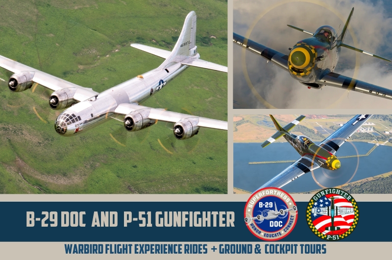 Tickets for flight experiences aboard both B-29 DOC and P-51 Gunfighter are available now at www.b29doc.com and www.p51gunfighter.com. Additional details on this weekend’s event—including tour schedules and future stops on the joint tour—can be found at www.b29doc.com/events. More locations featuring DOC and Gunfighter together will be announced soon. TICKETS FOR P-51 GUNFIGHTER: Click here to book your seat NOW. TICKETS FOR B-29 DOC: Click here to book your seat NOW