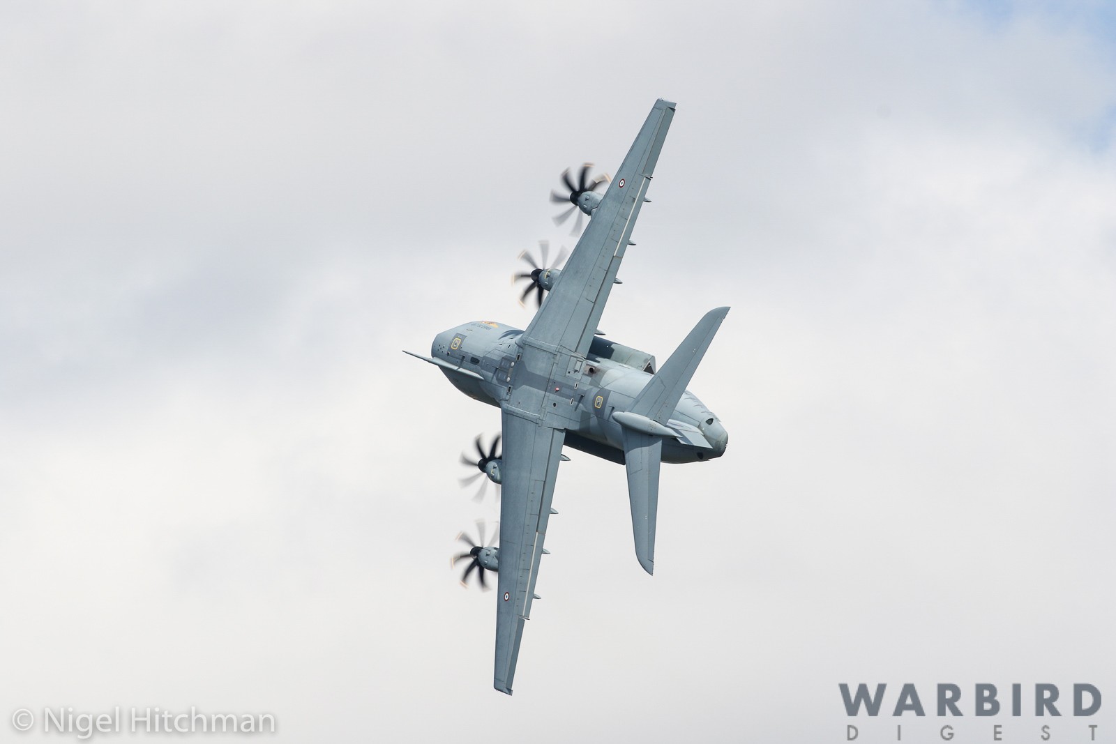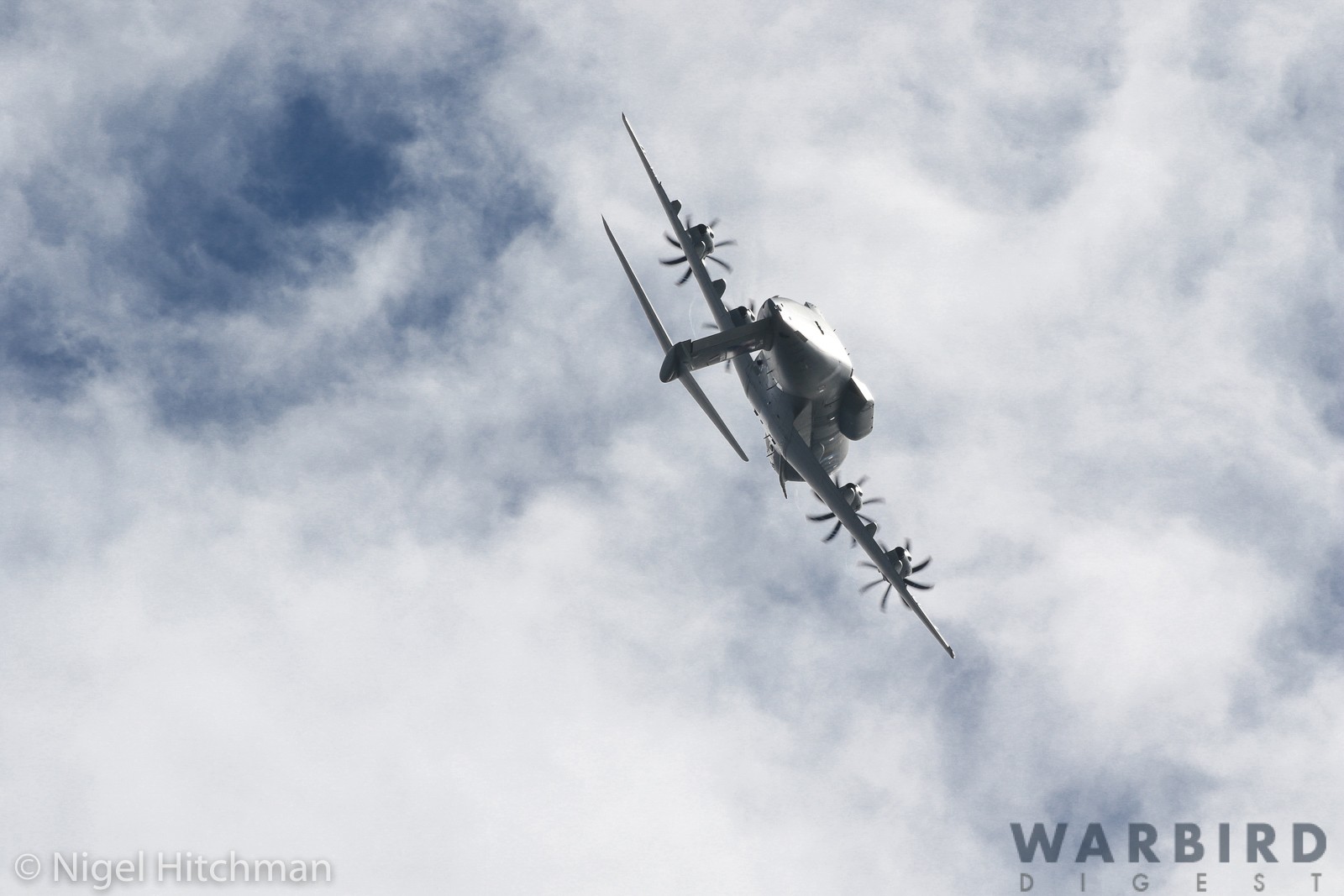 Showing off it’s rolling ability, the A-400M makes quite a sight! (photo by Nigel Hitchman)