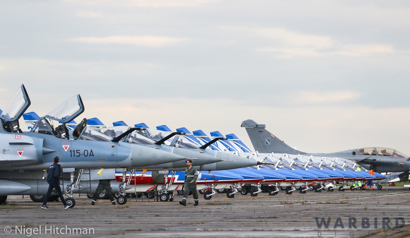 French military jets – Mirage 2000s to the left, Alpha Jets of the Patrouille de France, and a Rafale B. (photo by Nigel Hitchman)