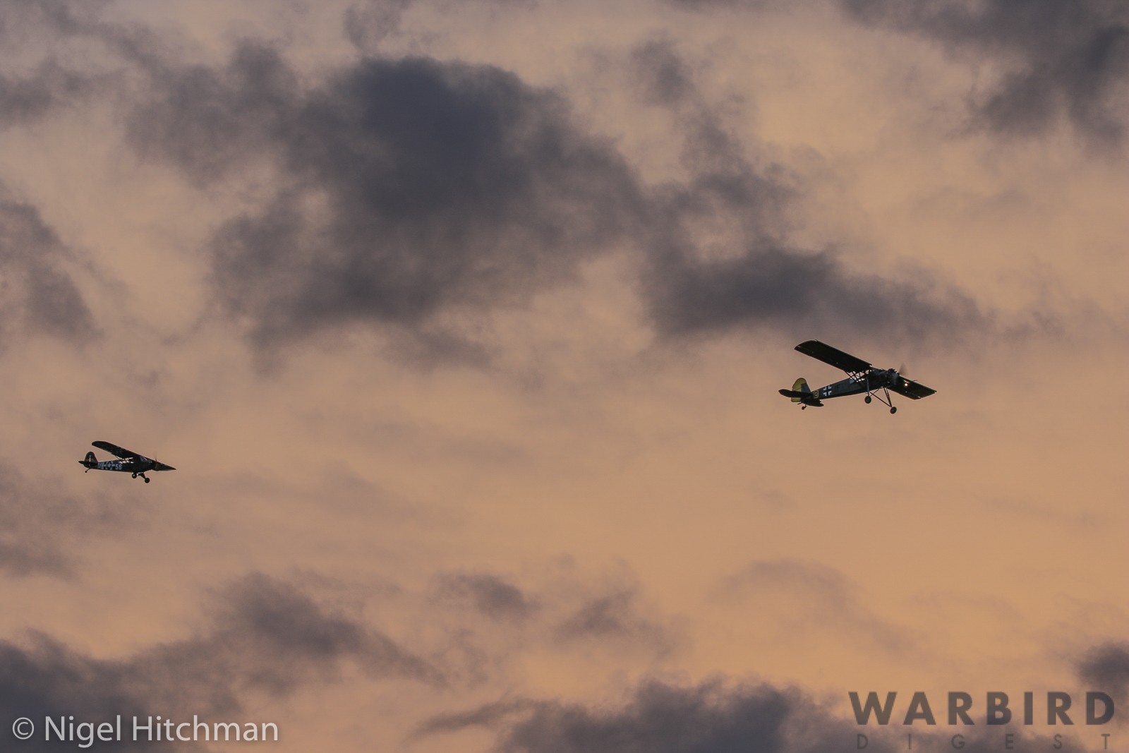 A Fieseler Storch (actually a French-built Morane M.S.505 F-BEJF) and Piper L-4 Cub F-GHIP re-creating one of the most bizarre air battles of WWII, when pilots in the two aircraft shot at each other with their pistols! (photo by Nigel Hitchman)