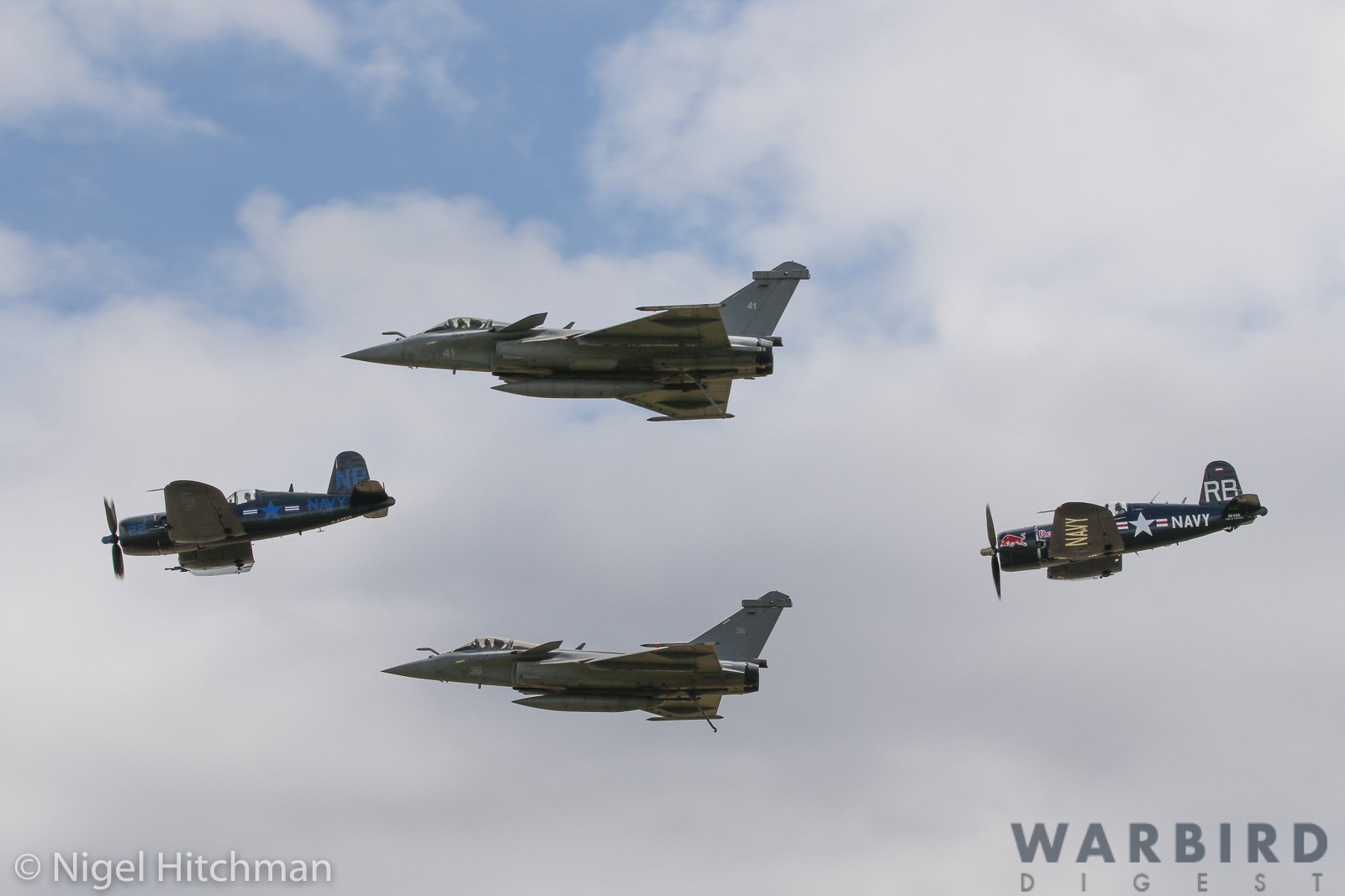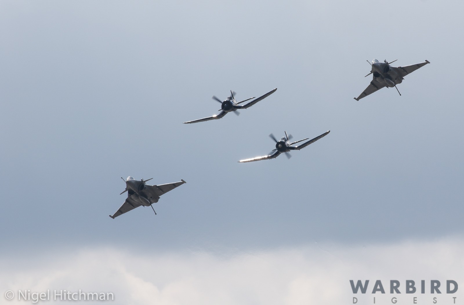 A nice study of the Corsairs in tight formation with a pair of Rafale M naval fighters. The French Navy flew F4Us from their aircraft carriers until 1967, so it was interesting to see the type perform a Heritage Flight with its modern-day replacement - albeit a couple of generations later. (photo by Nigel Hitchman)