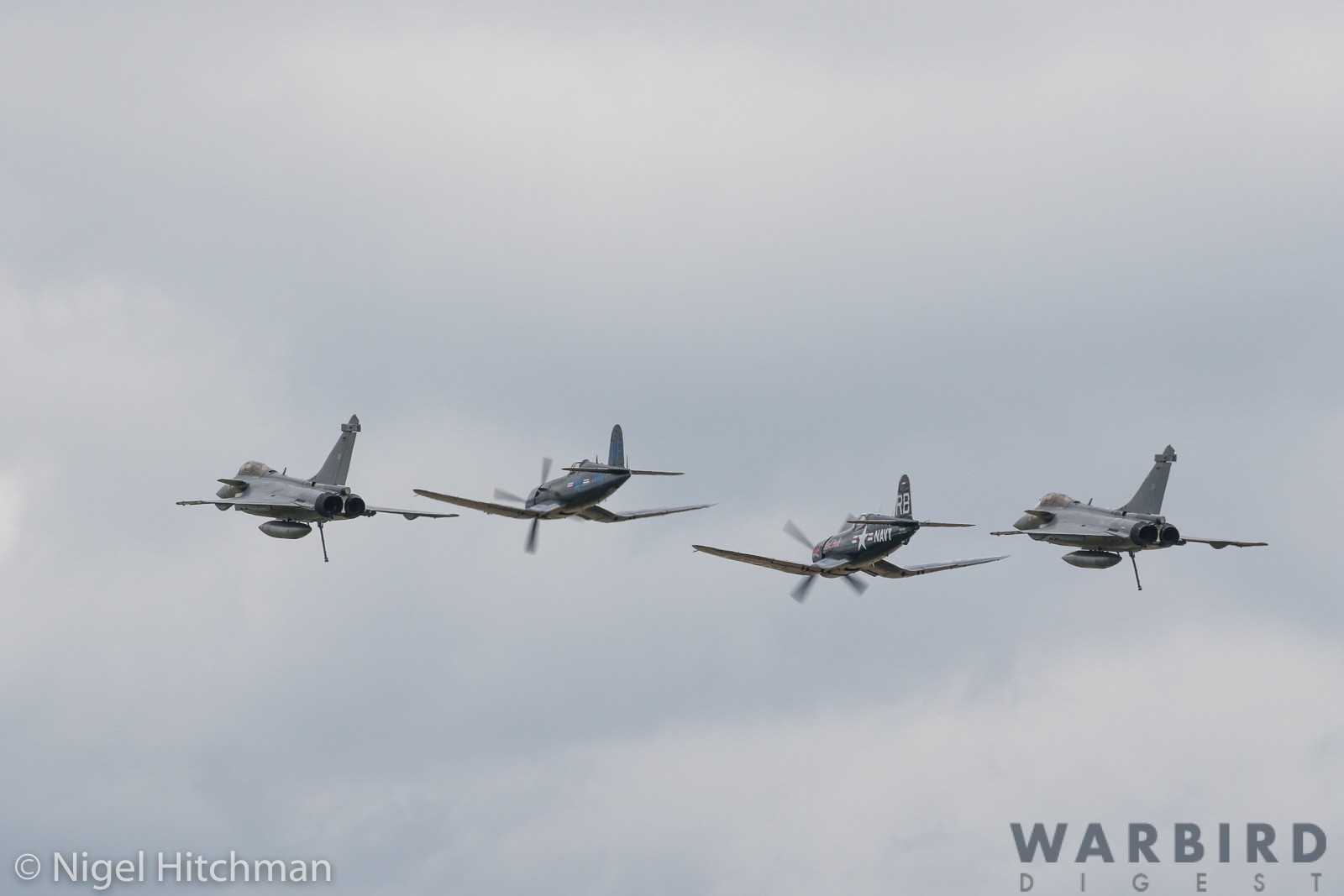 The two Rafales in formation with the F4U-4 and F4U-5 Corsairs. (photo by Nigel Hitchman)