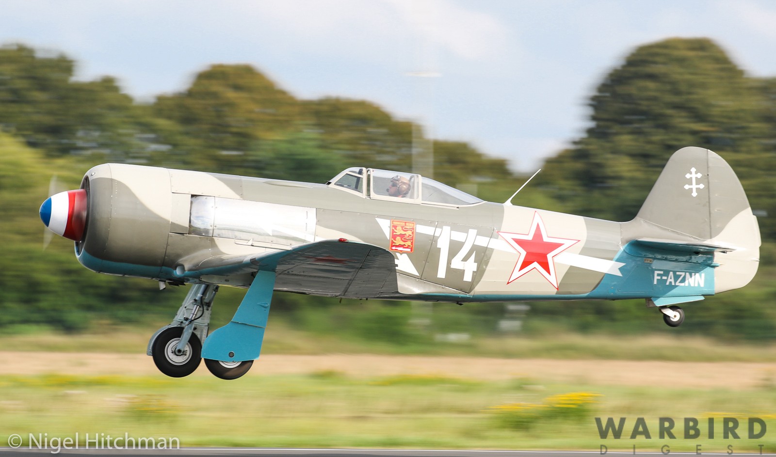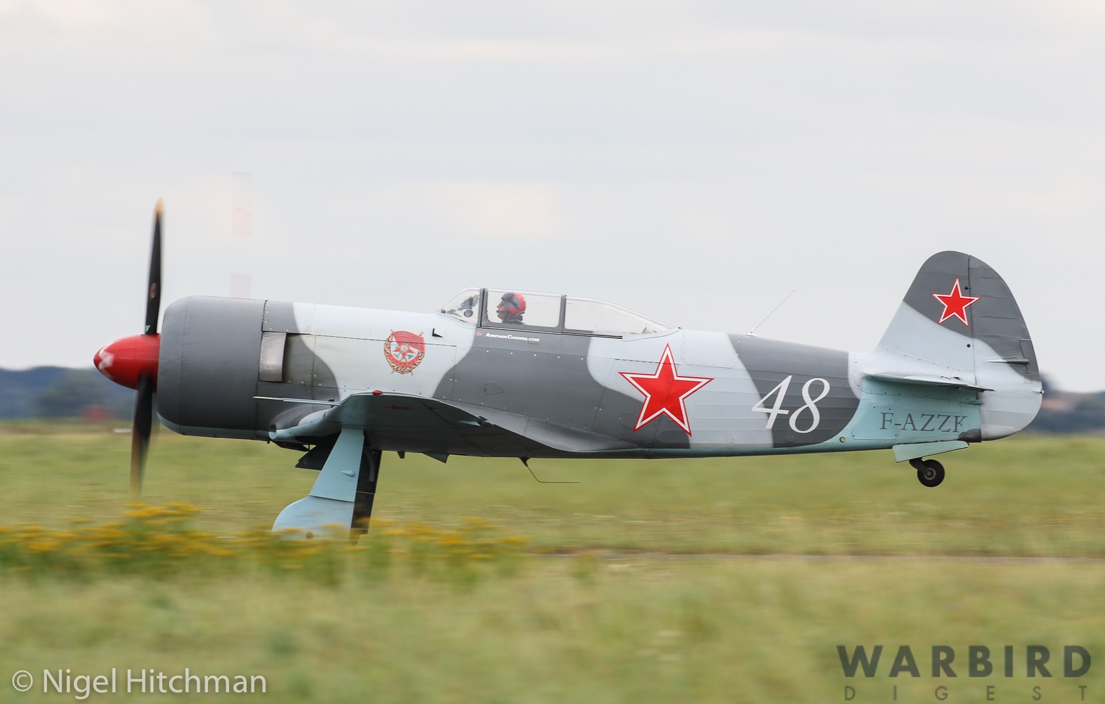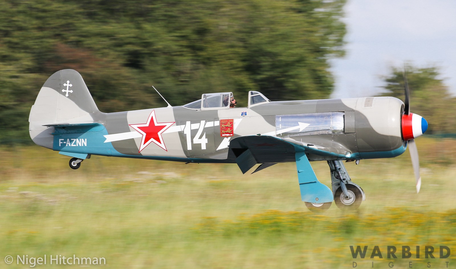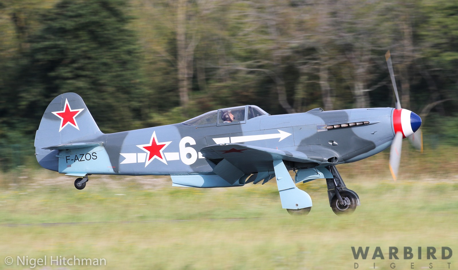 The Normandie-Nieman Squadron of French pilots serving in the Soviet Air Force during WWII was commemorated by the Yak-11 F-AZNN (converted to a single seater) and Yak-9P F-AZOS. The latter aircraft was originally a Czech-built Yak-11 tandem-seat trainer. Obtained from the Egyptian Air Force and taken to La Ferte Alais, it was later restored as a single seater in the US, and modified with the Allison V-1710 engine to represent a Yak-9P. The aircraft came back to France in the mid 2000s and has recently undergone a second restoration, with its first flight taking place last year at La Ferte Alais.