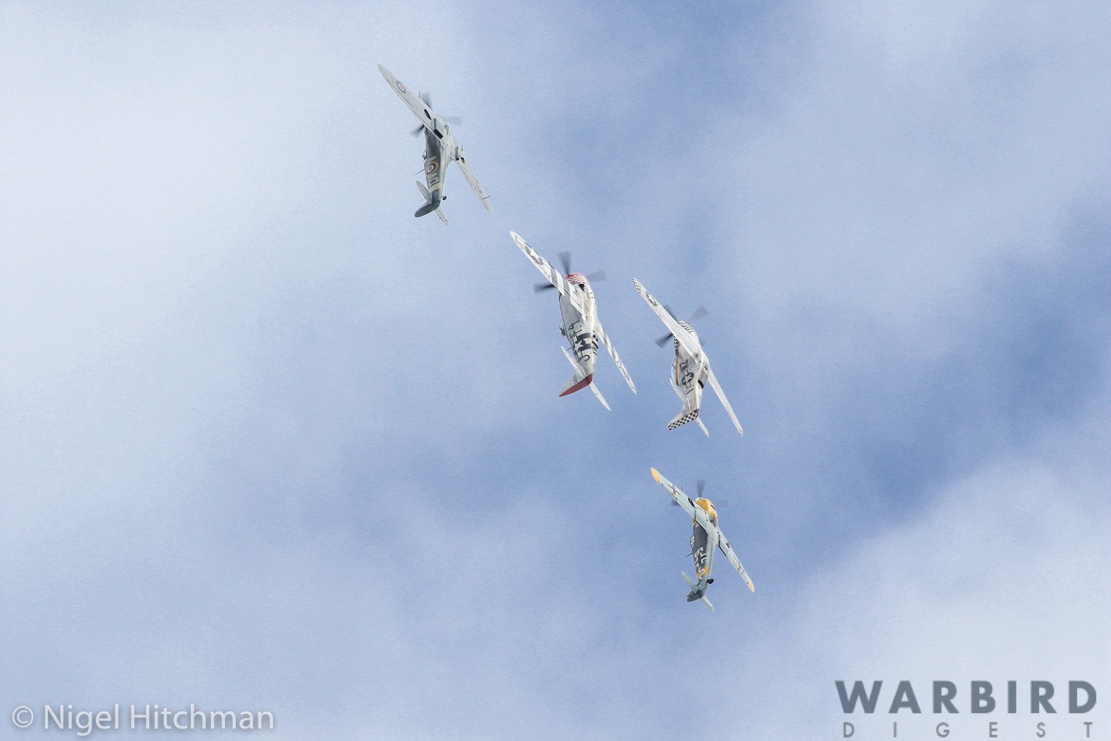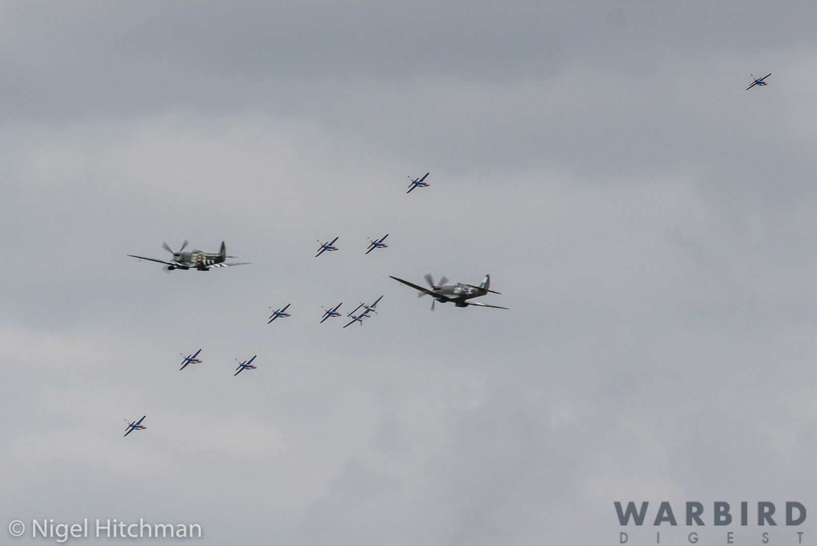 Two Spitfires with the Saint Exupery formation behind them. (photo by Nigel Hitchman)