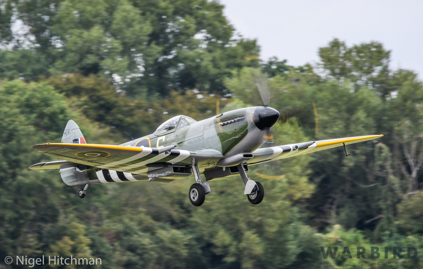 Supermarine Spitfire Mk.XVI SL721 retains much of its Vintage Wings of Canada paint scheme, but now with invasion stripes and a different side code. The VWoC tribute to 421 Squadron pilot William Harper remains on the cockpit side, however. (photo by Nigel Hitchman)