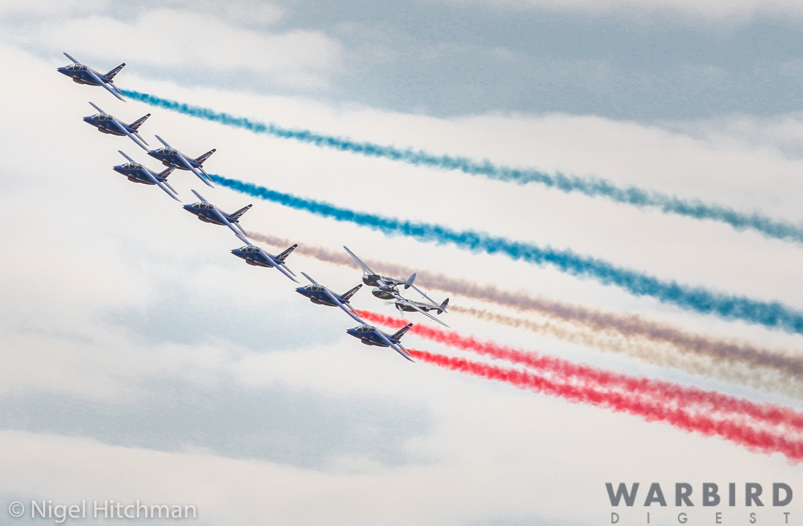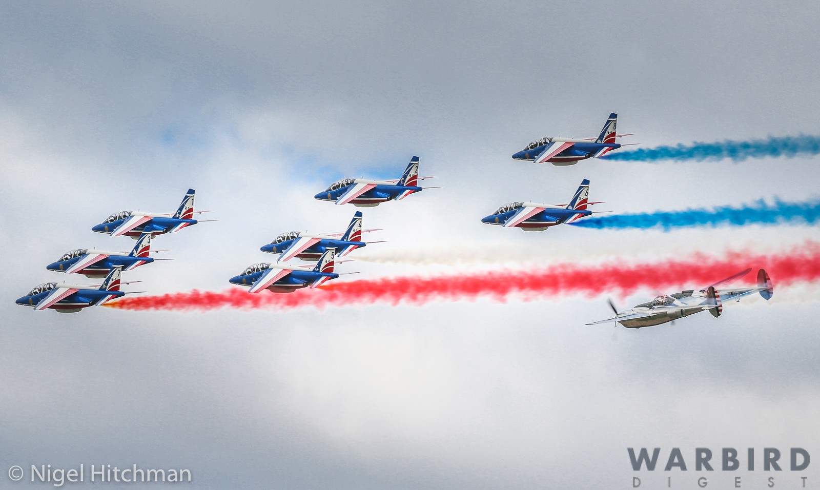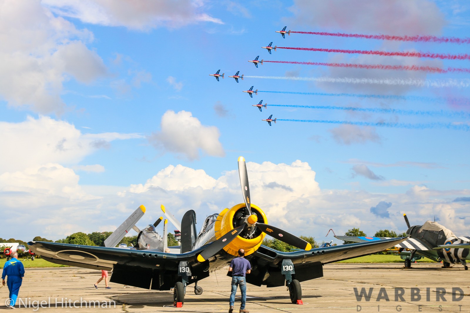 The Patrouille de France cutting a glorious image above the Salis Collection’s F4U-5. (photo by Nigel Hitchman)