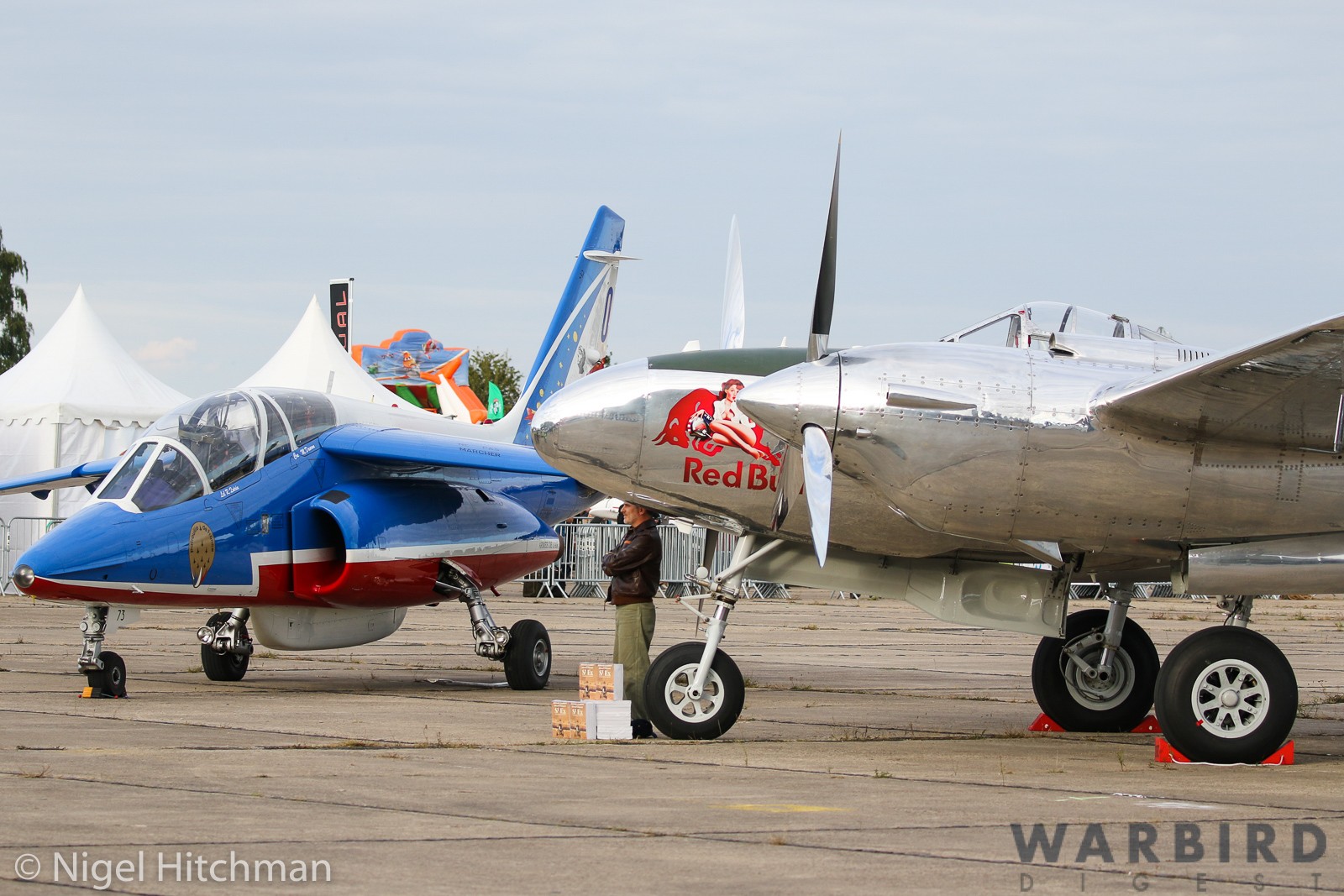 The Red Bull P-38 parked next to one of the Patrouille de France Alpha Jets. (photo by Nigel Hitchman)