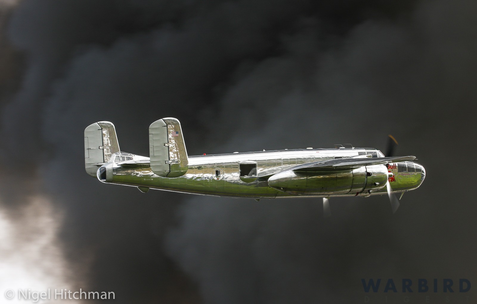 The Red Bull B-25J Mitchell in a dynamic pass with smoke billowing from the simulated bomb strikes exploding on the ground below. (photo by Nigel Hitchman)