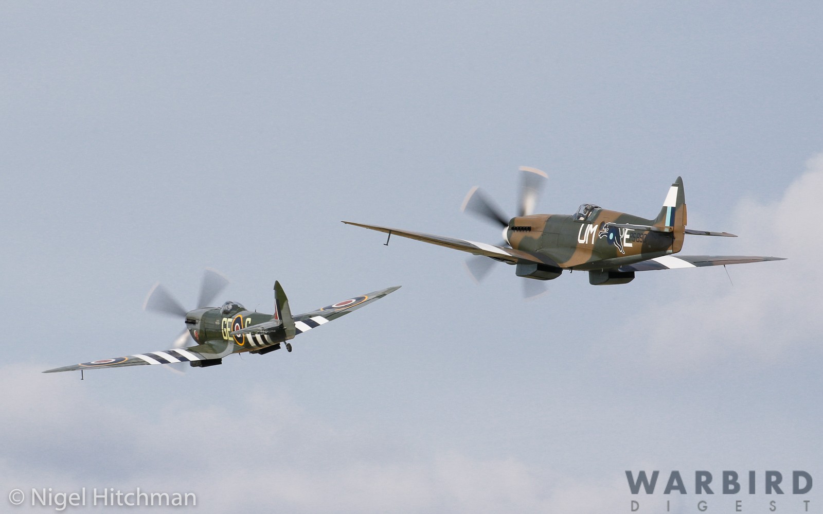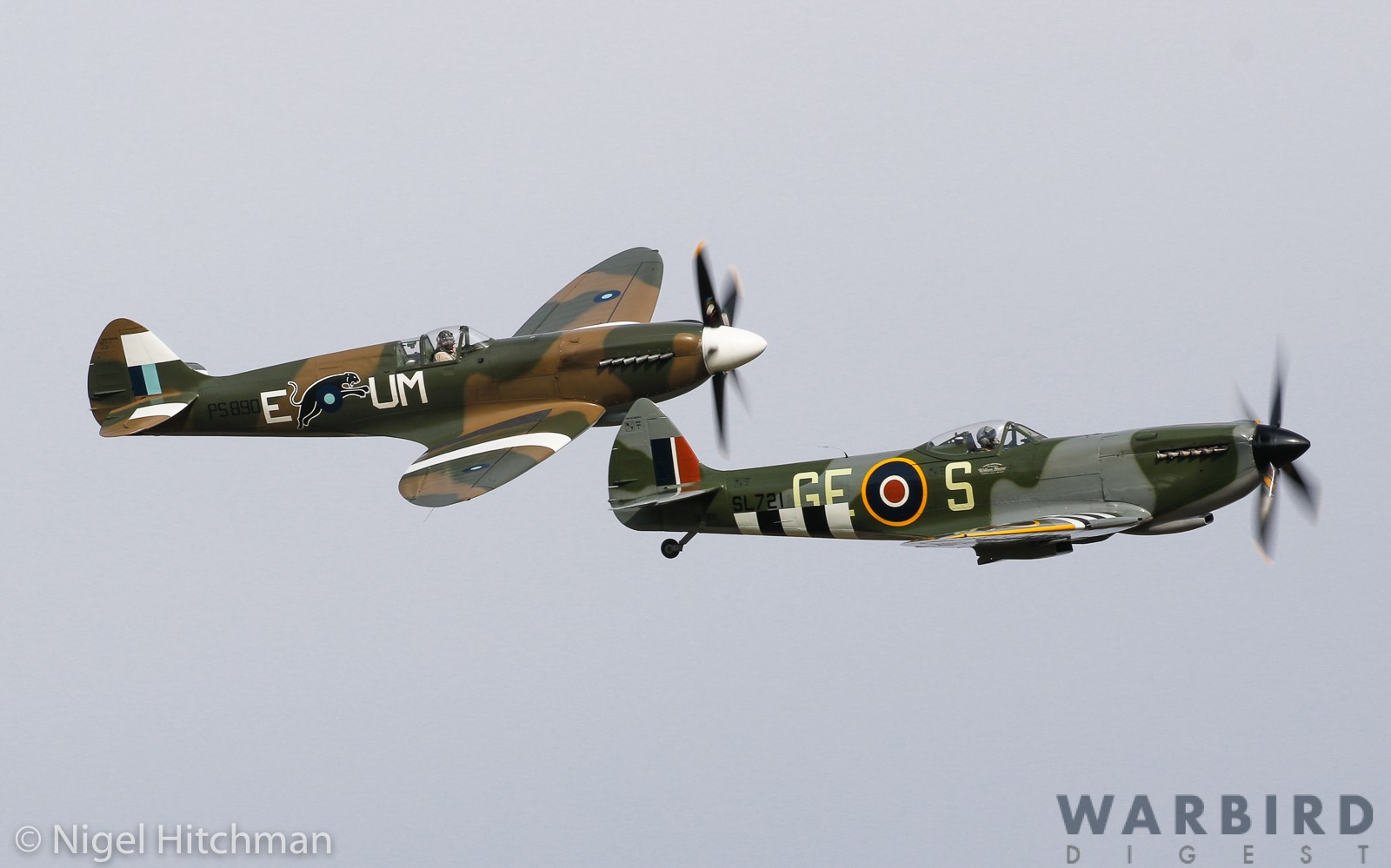 Spitfire Mk.XVI SL721 leading Spitfire PR.Mk.XIX PS980 in formation. (photo by Nigel Hitchman)