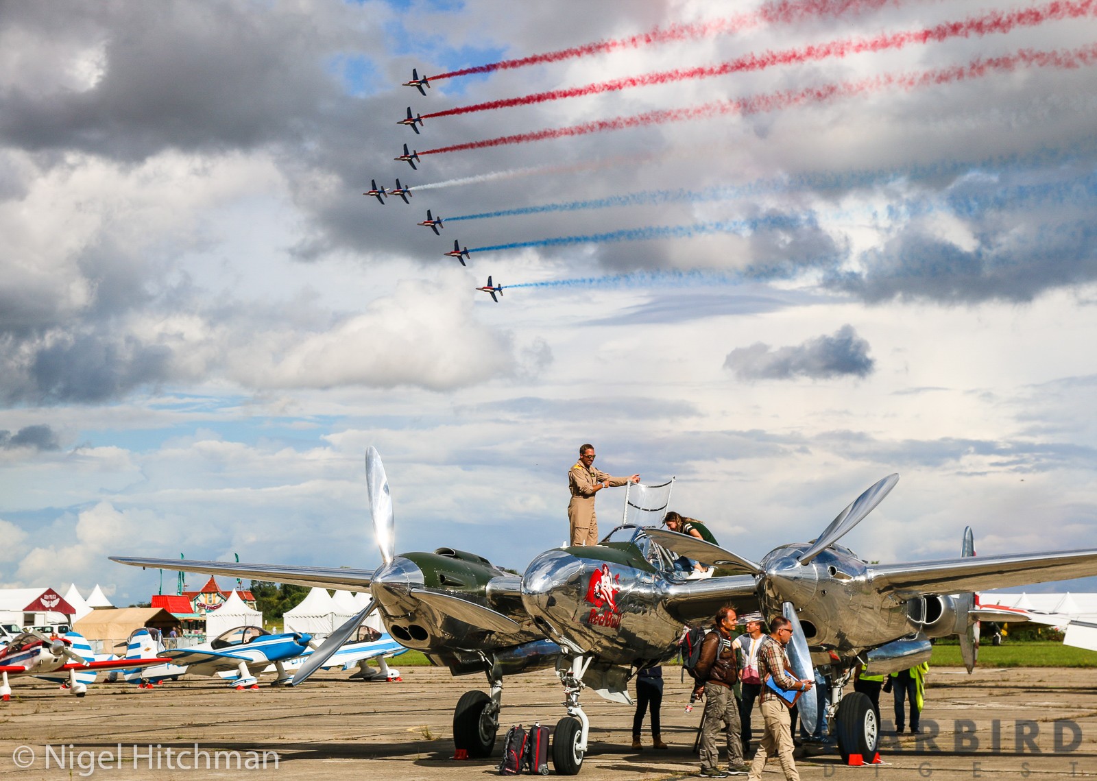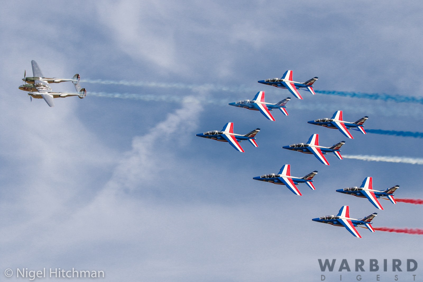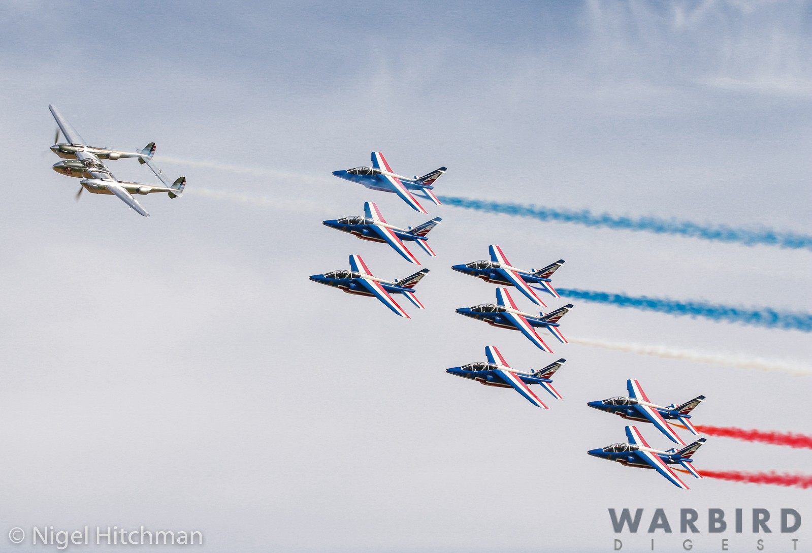 The Patrouille de France flying above Red Bull’s magnificent P-38L Lightning. (photo by Nigel Hitchman)