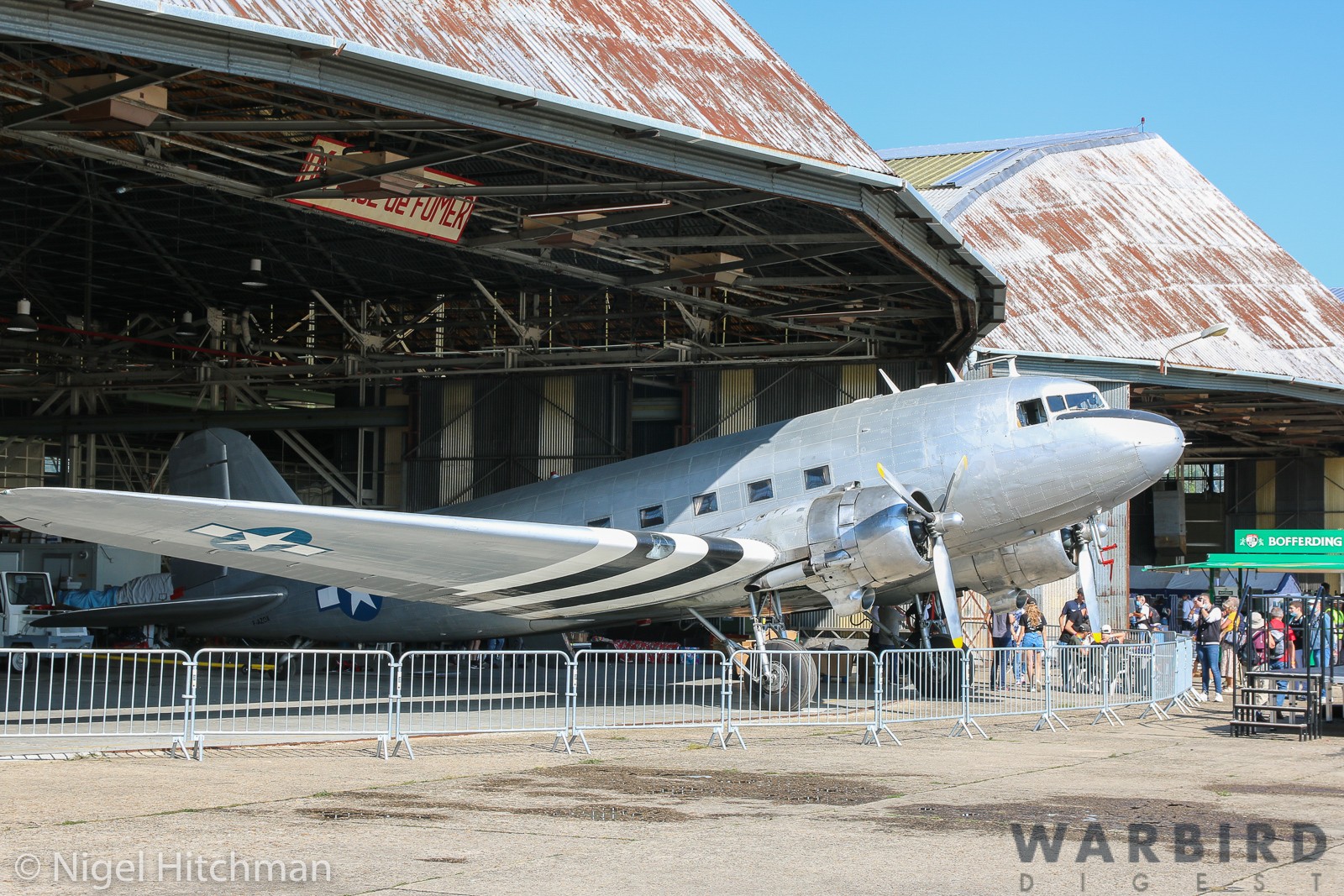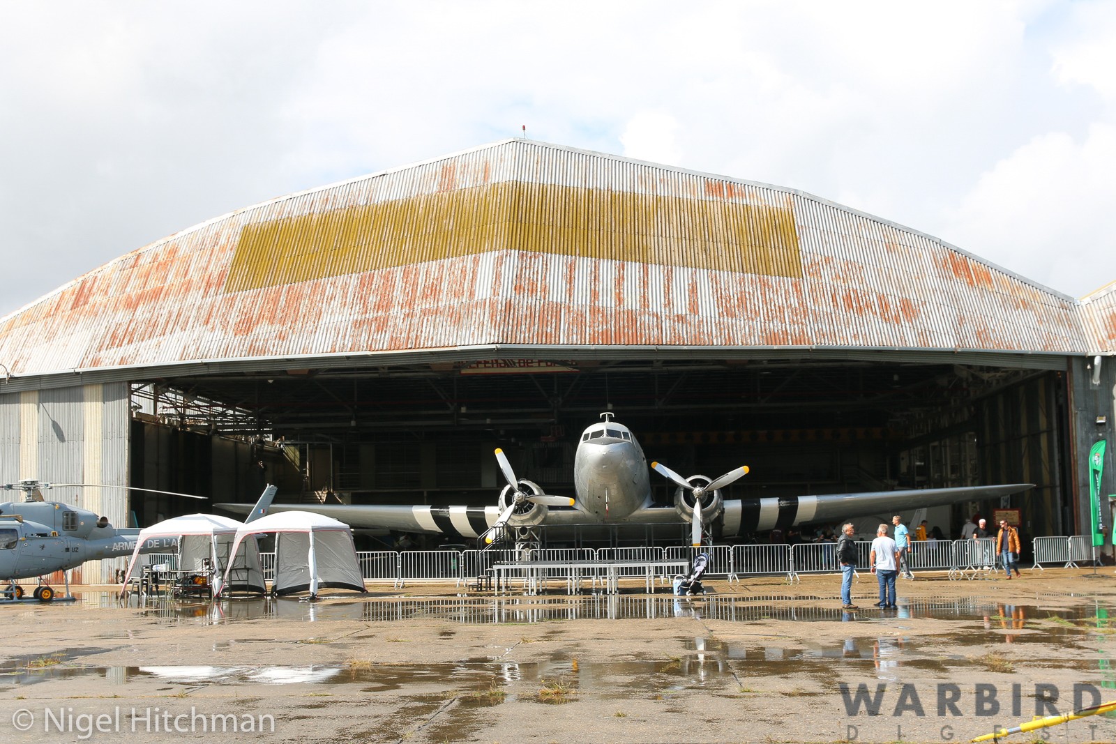 A C-47 peering from one of the hangars at Melun-Villaroche. (photo by Nigel Hitchman)