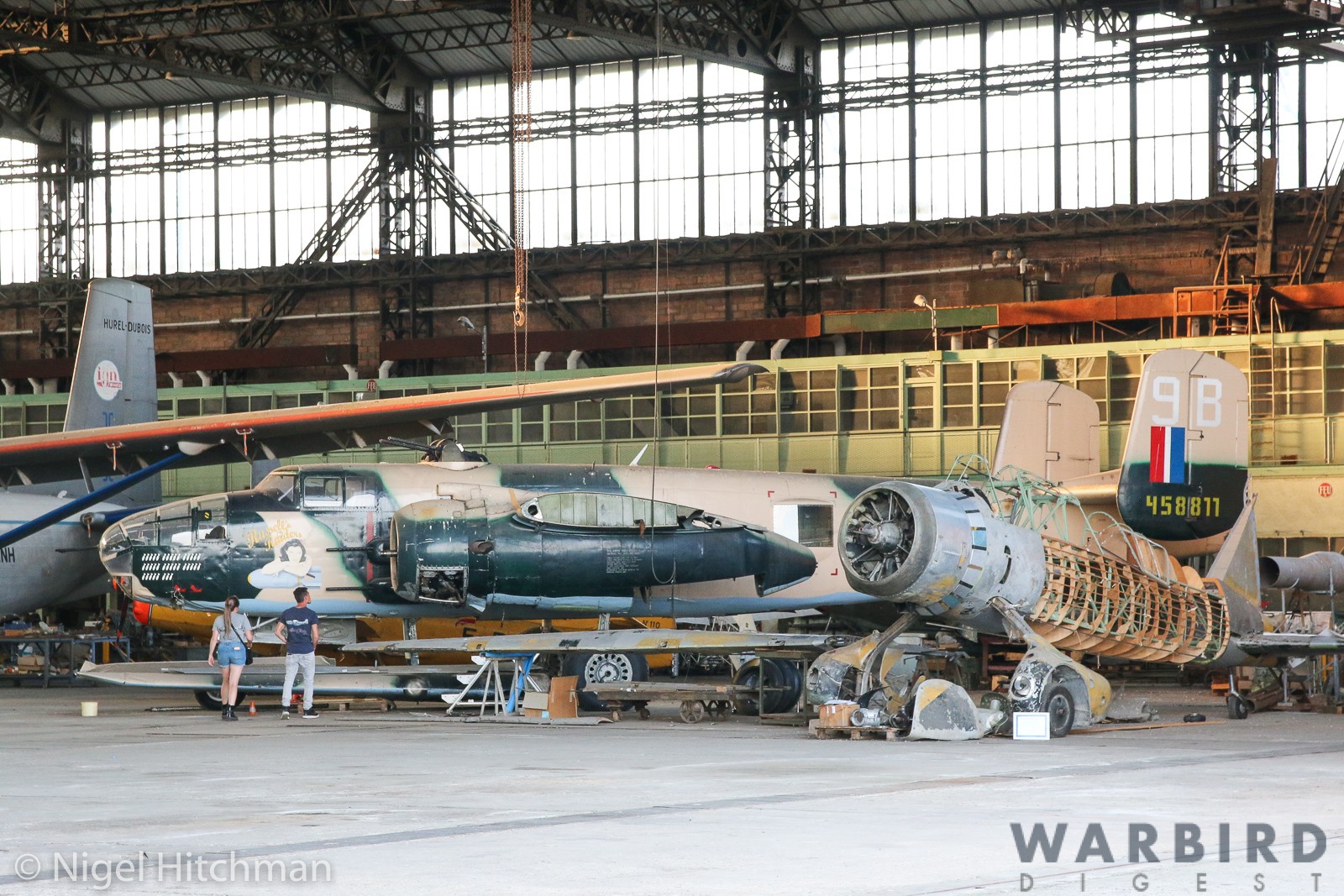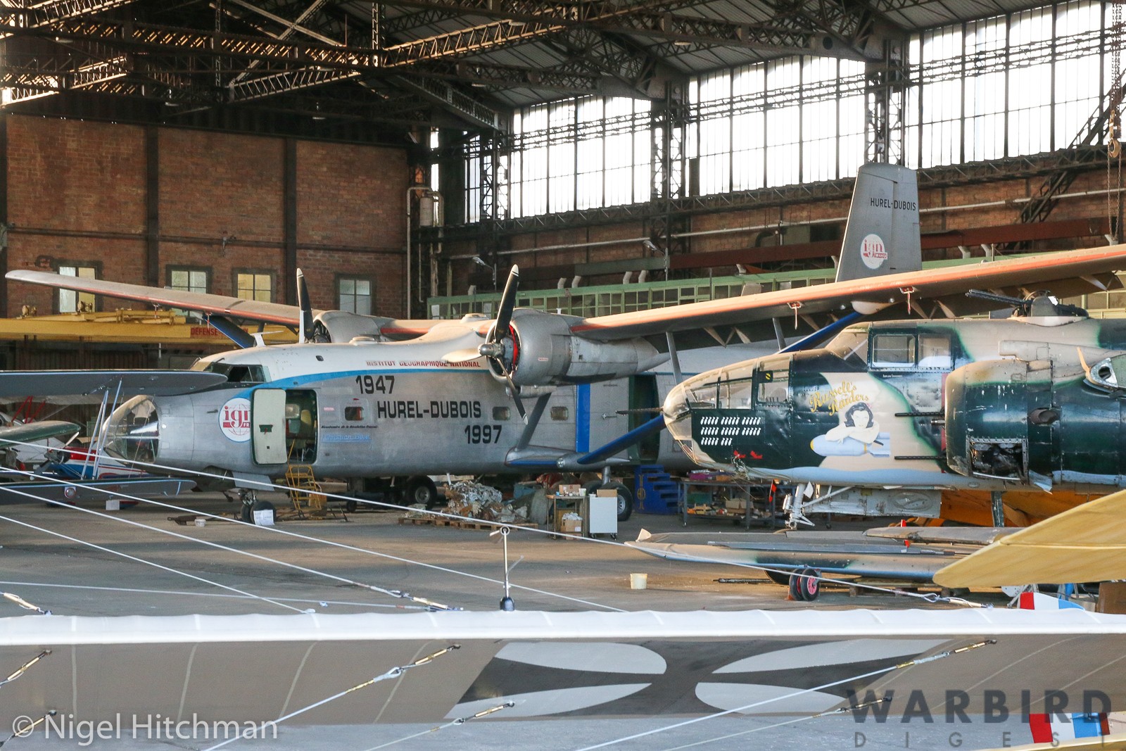 Inside the AMPAA hangar. The unusual twin engined transport beyond the B-25 is the Hurel-Dubois H.34. The Institut Geographique National (IGN) used this type in small numbers for aerial survey work. (photo by Nigel Hitchman)
