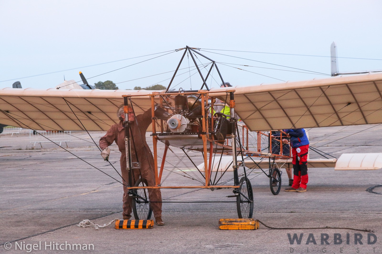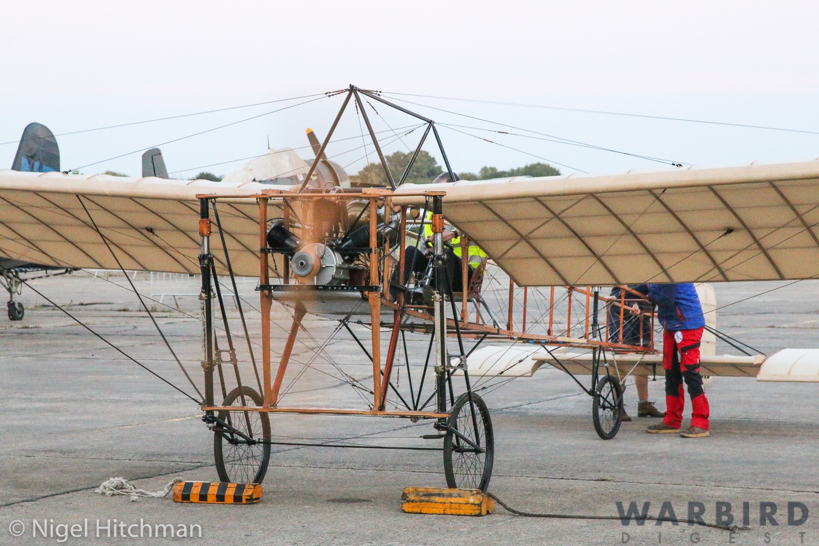 The “Channel crossing” Blériot XI (F-AZQB) operating its original 25hp Anzani engine for the first time on the Saturday evening. (photo by Nigel Hitchman)