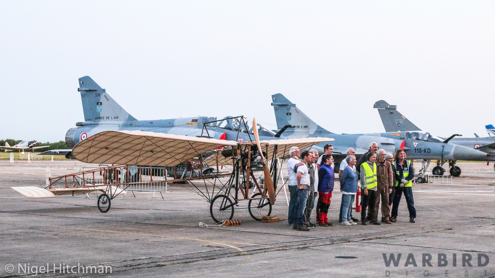 A proud team standing in front of the Blériot following its succesful, first engine run. It’s amazing to think that just seven decades separates the technology of the Mirage 2000 (in its first form) and the fragile Blériot. (photo by Nigel Hitchman)