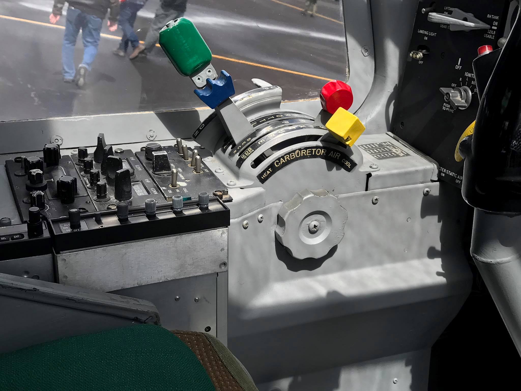 Throttle quadrant of Aermacchi AM.3CM Bosbok (Bush-buck), N949CM at McNary Field, Salem, Oregon. (Randy Malmstrom)