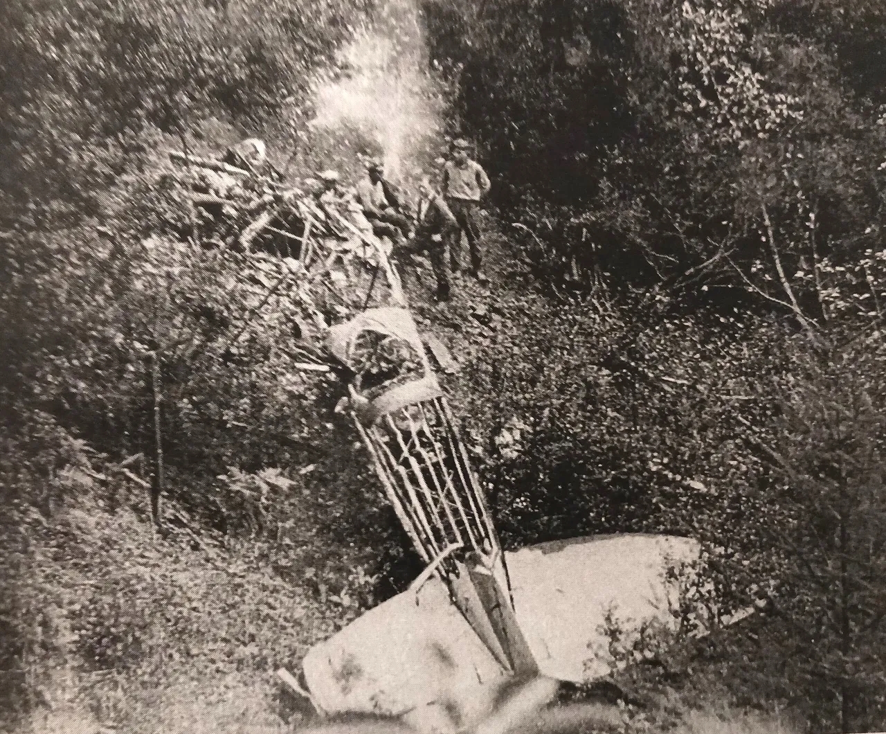 On October 2, 1928, pilot Grant Donaldson took off in the aircraft on a flight from Medford, Oregon, to Portland, Oregon. He was carrying 9 pounds of mail and passenger D.P. Donovan (a West Coast drugstore chain owner and gemstone dealer, carrying a satchel of diamonds). An hour into the flight through low-lying clouds over a mountainside near Canyonville, Oregon, he discovered he was scraping tree-tops. Too late to recover, it dove forward “…as if it had been a giant scythe” (as reported in the Roseburg, Oregon News-Review at the time). One tree, nearly a foot in diameter, was sheared off 25 feet above ground. The resulting fire melted the propeller. Donaldson escaped with severe burns (his scars with the markings of his flight goggles remained with him for the remainder of his life). Donovan was killed on impact. The next day, the airline salvaged his body and what diamonds they could (scavengers hiked up to the wreck site for years afterwards looking for diamonds, and rumors persist that some Canyonville women own rings set with the diamonds). In 1929, the tail section was hacksawed off for use as a nursery school jungle gym.