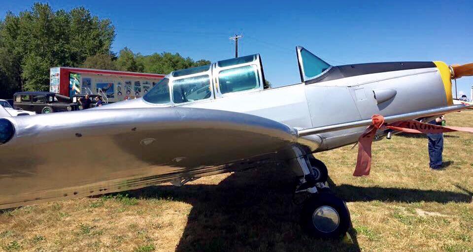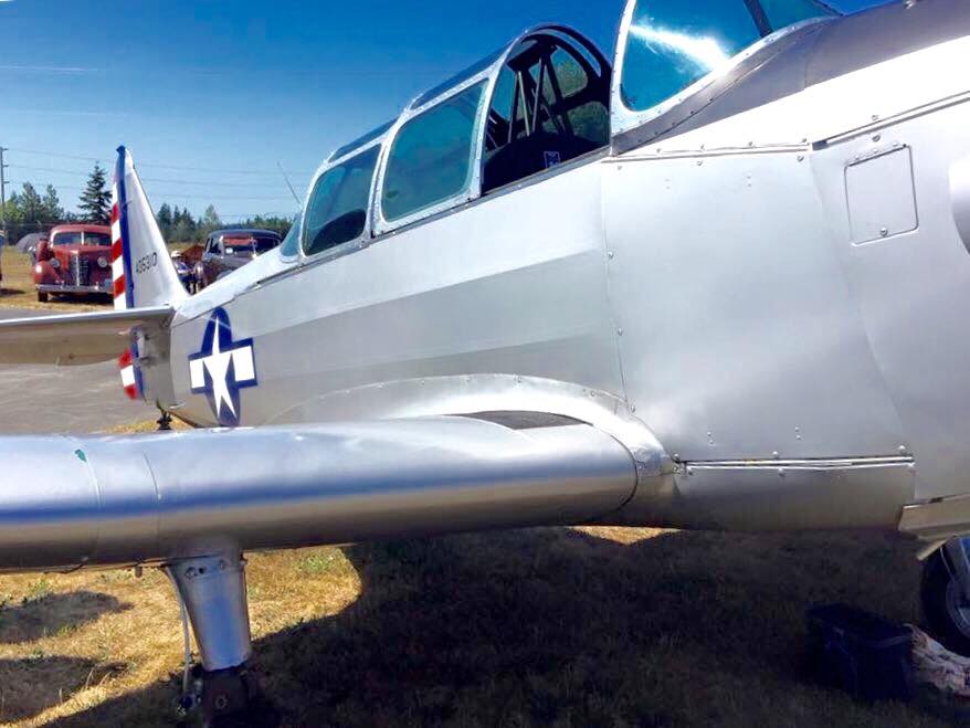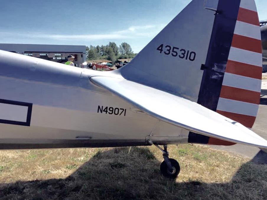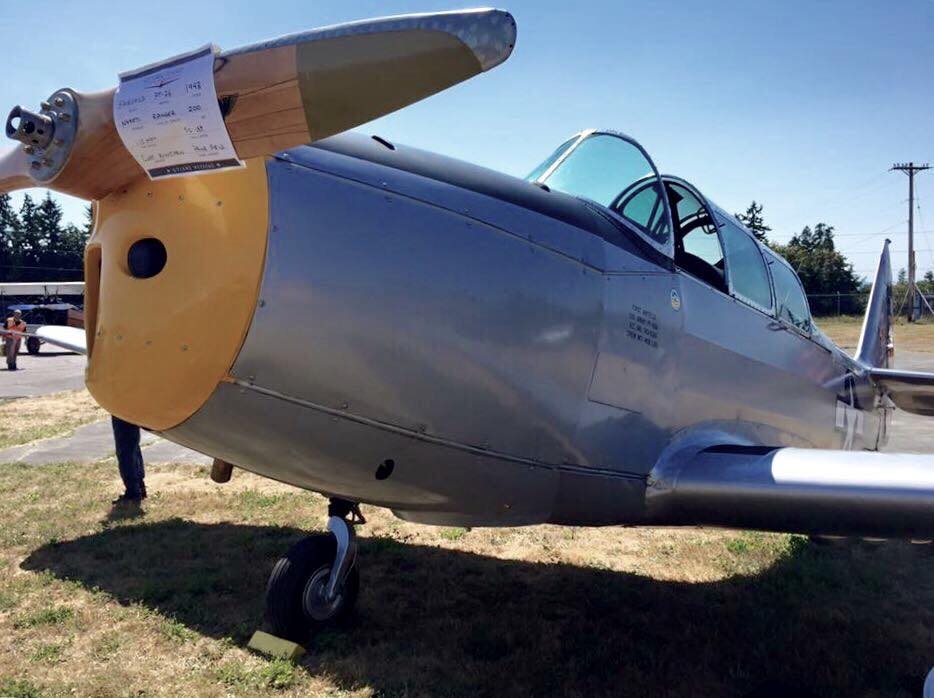 Fairchild PT-26 Cornell, c/n T43-5310, N49071. This particular aircraft has been restored with the silver paint scheme of the U.S. Army Training Command, the correct color for the U.S. usage of the PT-26. The Royal Canadian Air Force aircraft were painted yellow (blue and yellow having been discontinued before most of the Cornell’s were put into service). This aircraft was built in 1943, and I have seen evidence of it in the U.S. Pacific Northwest, Pangborn Field, Wenatchee, Washington, in 1969, for example. My photos.