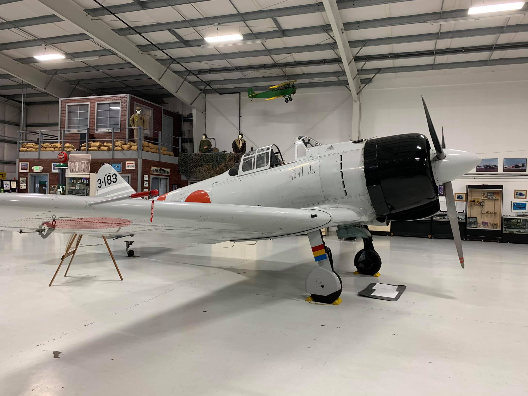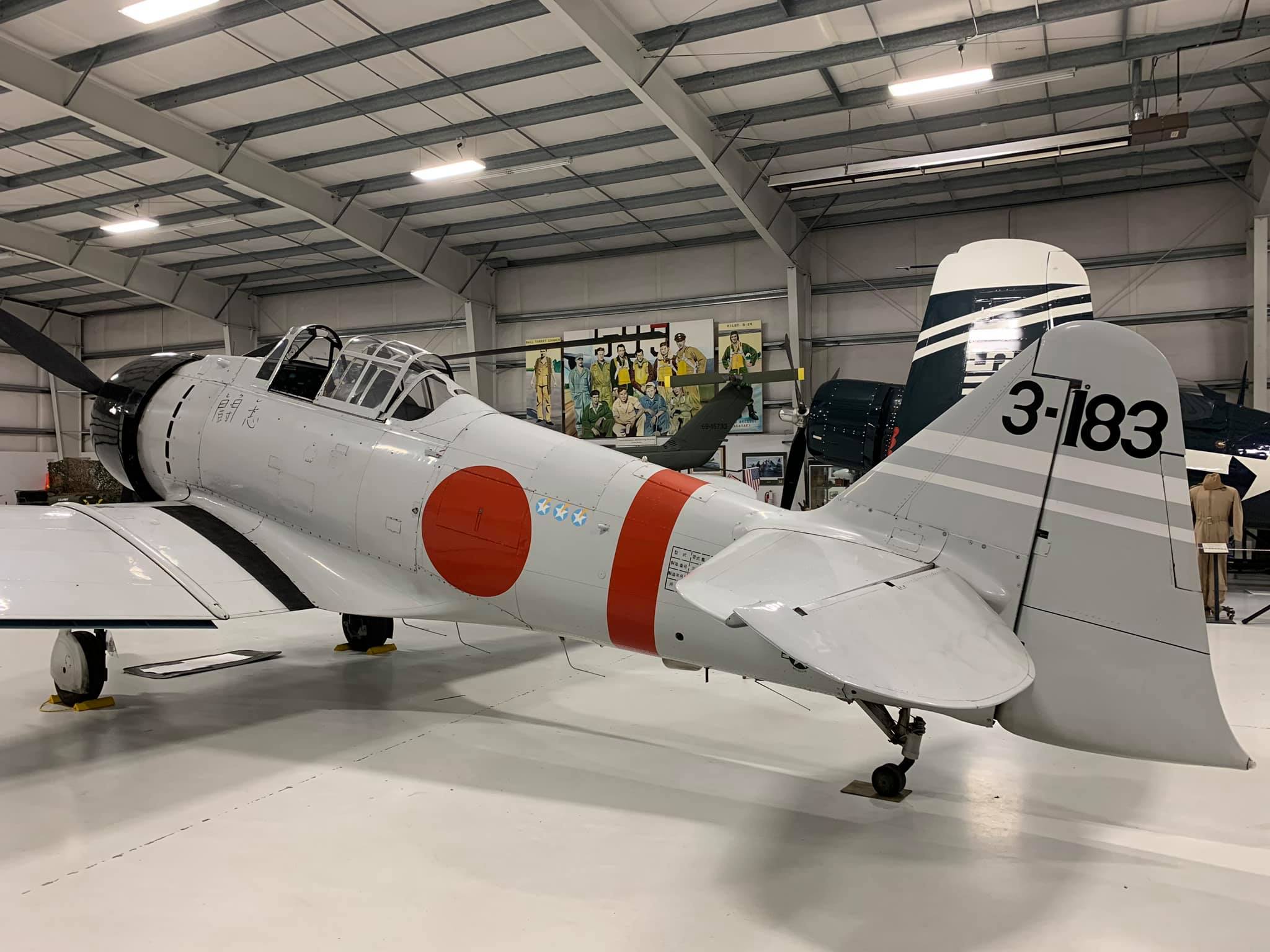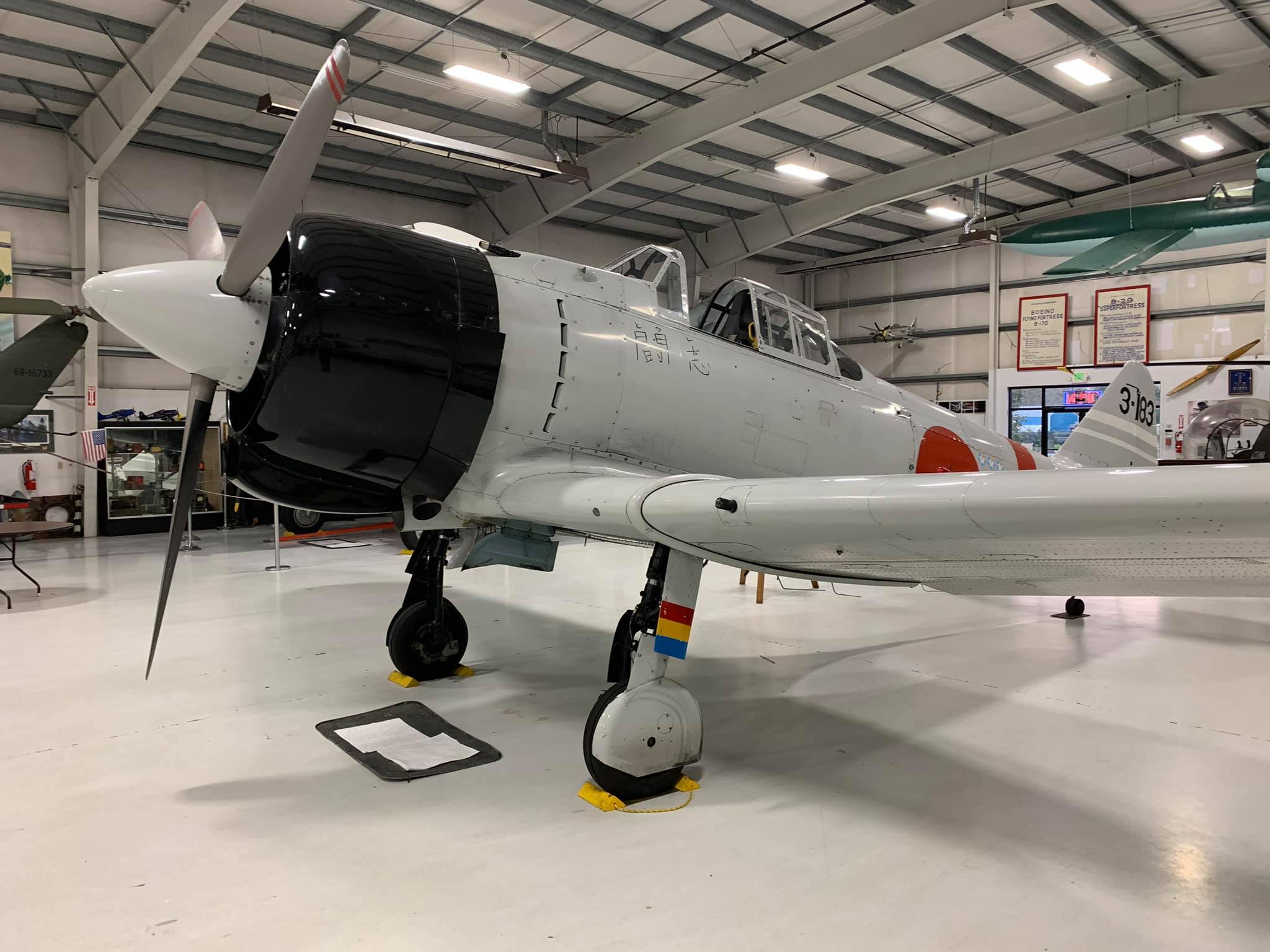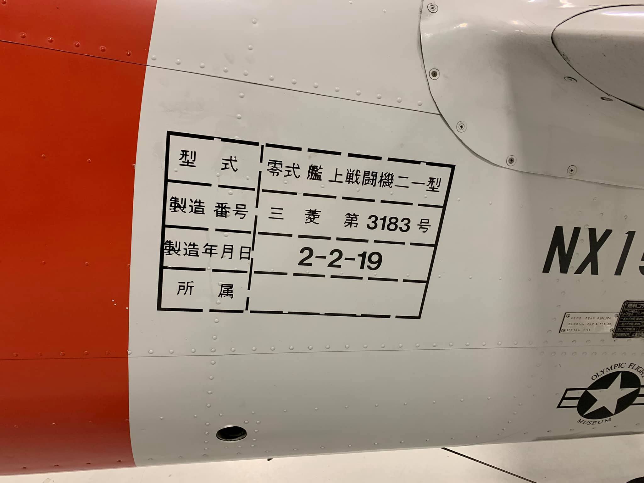 From what I can tell, this aircraft was built in 1952 by Canadian Car and Foundry and was assigned to the Royal Canadian Air Force and was stricken from the record as of March 25, 1968. It was sold to 20th Century Fox in 1969 at which time it underwent conversion to the A6M2 replica, tail code 3-183. In 1971 it was sold to Northwest Helicopters Inc. and then Olympic Jet Inc. in 2001. It is fitted a Pratt & Whitney R-1830 engine and landing gear indicators atop the wings (as seen on the T-6/SNJ/Harvard). It does have the strut load stripes on the main undercarriage covers (that measure compression) as seen on the Zero.