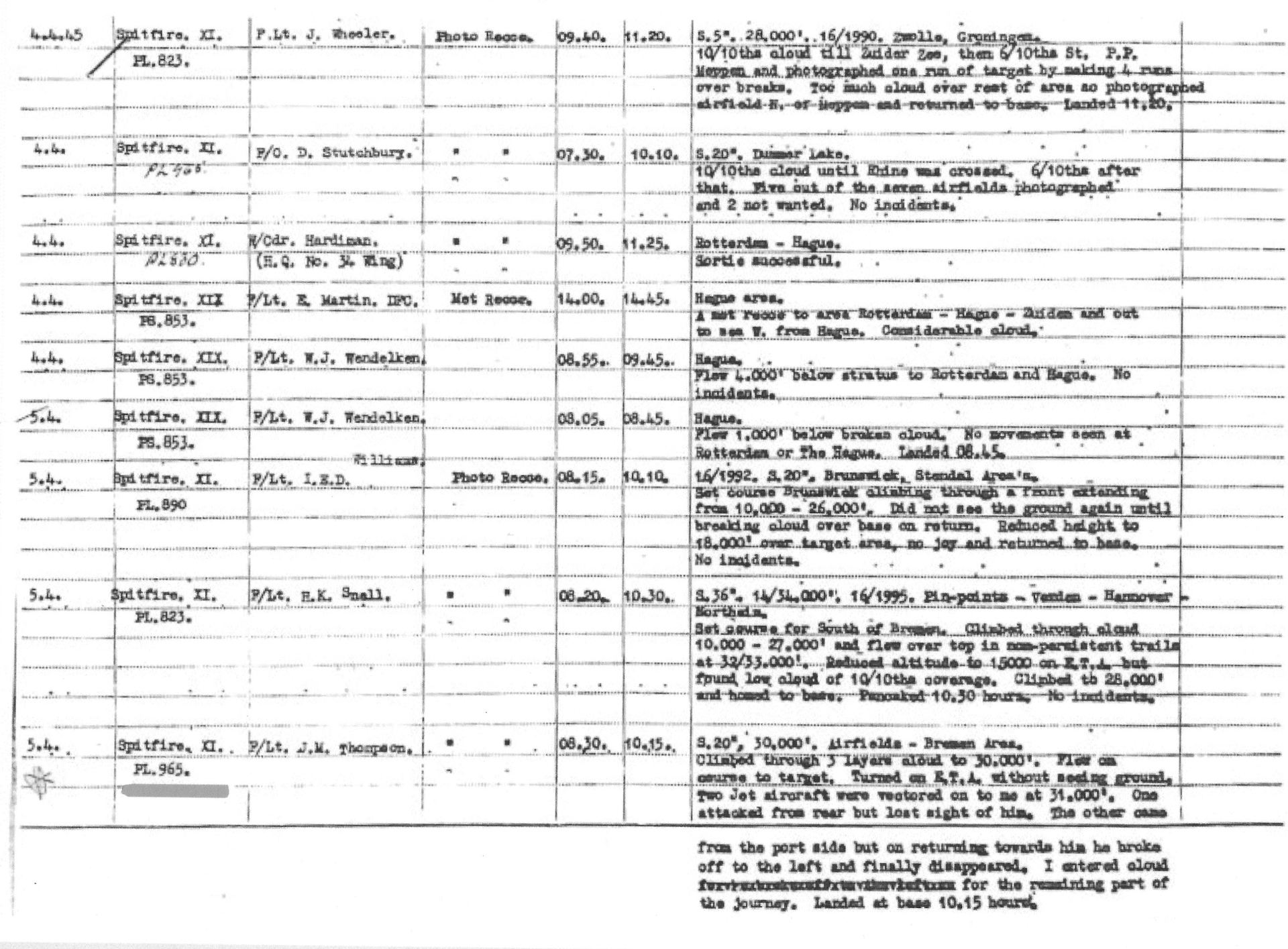 PL965 was built in mid-1944 at Aldermaston as a P.R. Mk XI, the photographic reconnaissance version of the Spitfire. Unlike the better-known fighter variants, it was intended for high-altitude, high-speed work, operating above 30,000 feet and capable of speeds in excess of 400 mph, which makes it the fastest Merlin-powered Spitfire. After an initial stint with No. 9 Maintenance Unit at Cosford, the aircraft was passed on to No. 16 Squadron, which was operating out of Melsbroek Airfield in Belgium as part of the Second Tactical Air Force. These PRU Blue Spitfires flew unarmed and typically alone, carrying out photo reconnaissance over enemy territory, including bomb damage assessment and mapping work. Over the course of its service, PL965 flew more than 40 operational sorties over Germany, France, and the Netherlands, including missions to Bremen, Hamburg, Kiel, and Berlin.