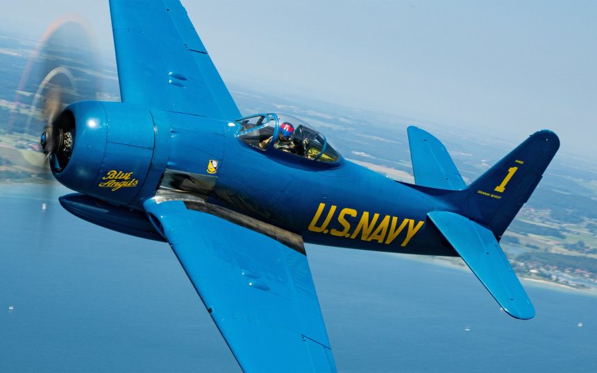 The Blue Angels first flew the F8F Bearcat in late 1946, just months after the team’s debut in the F6F Hellcat. The Bearcat was the last propeller-driven aircraft used by the team and was notable for its exceptional power and agility. It was during the Bearcat era that the Blue Angels first introduced their now-famous diamond formation, as well as the “Beetle Bomb” routine—a mock dogfight featuring a Bearcat painted to resemble a Japanese Zero.